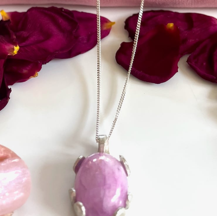 This is a purple rainbow moonstone measuring 2 cm long wrapped in sterling silver and hanging on a pretty 18 inch chain. The whole effect makes me think of a hug.