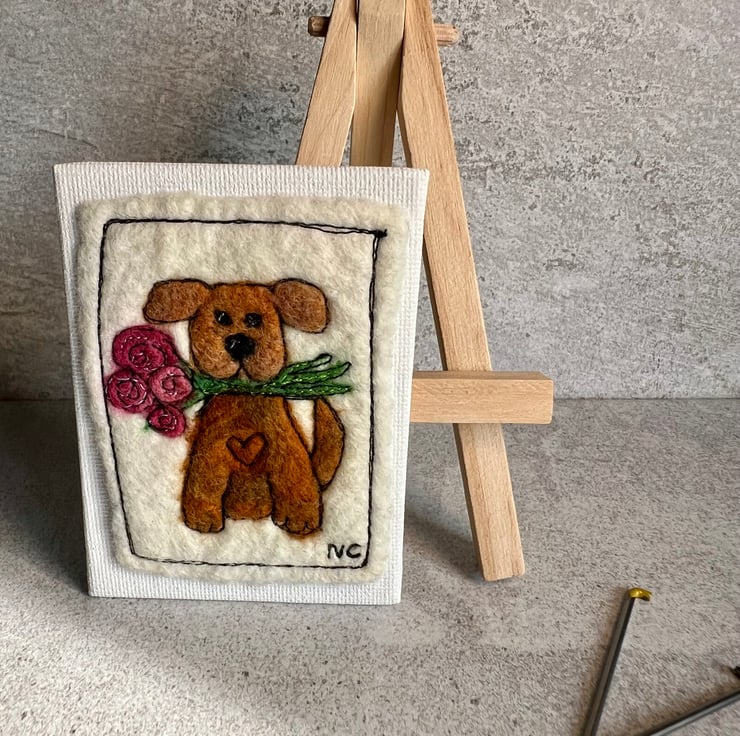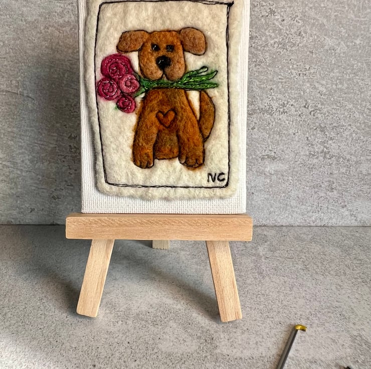 Wet felted, needle felted hand and machine embroidered mini dog canvas with easel