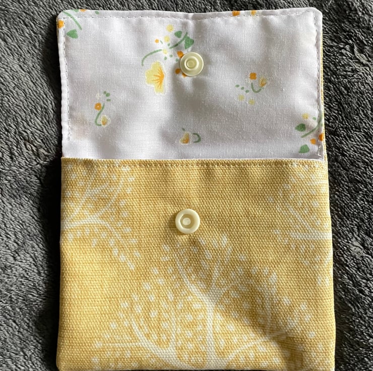 This cute coin/ card purse is made with yellow trees upholstery cotton, is lined with a complimentary coloured poly cotton and is finished with a Kam snap.