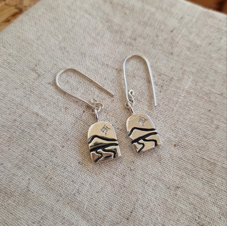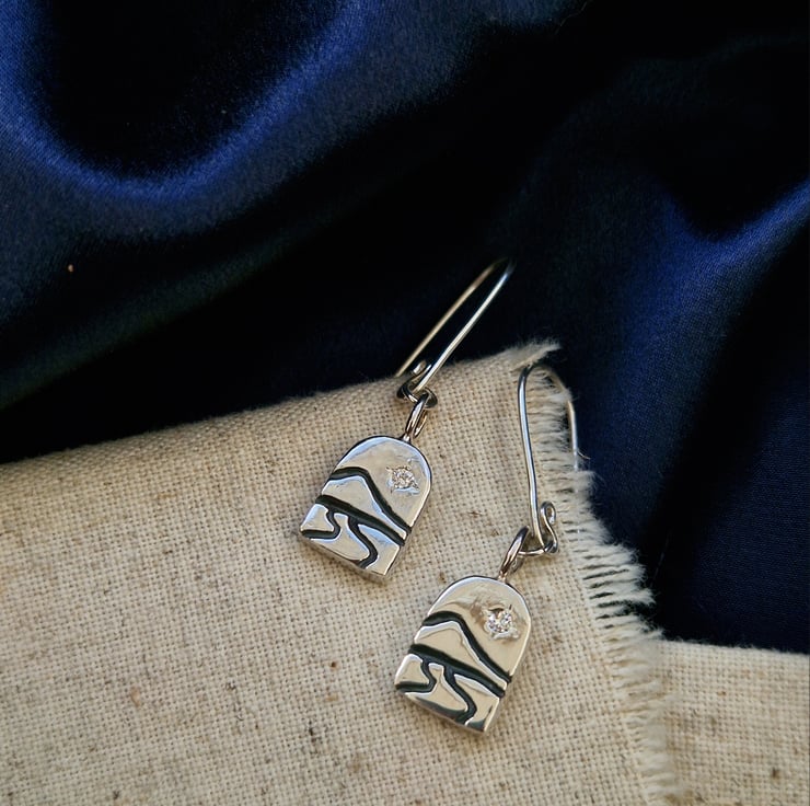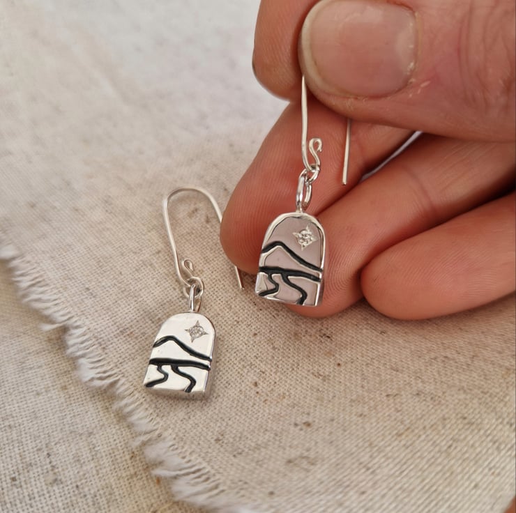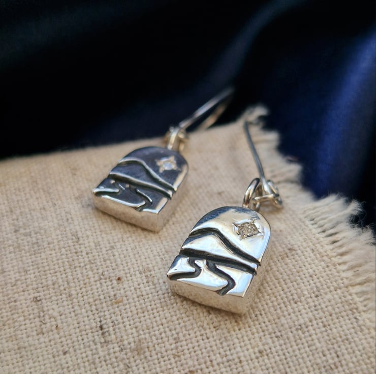 Each piece is hand carved in wax before being cast in solid sterling silver and finished by hand. I engraved lines to suggest a quiet landscape, with a small lab-grown diamond set into each piece to represent a guiding star in the distance.