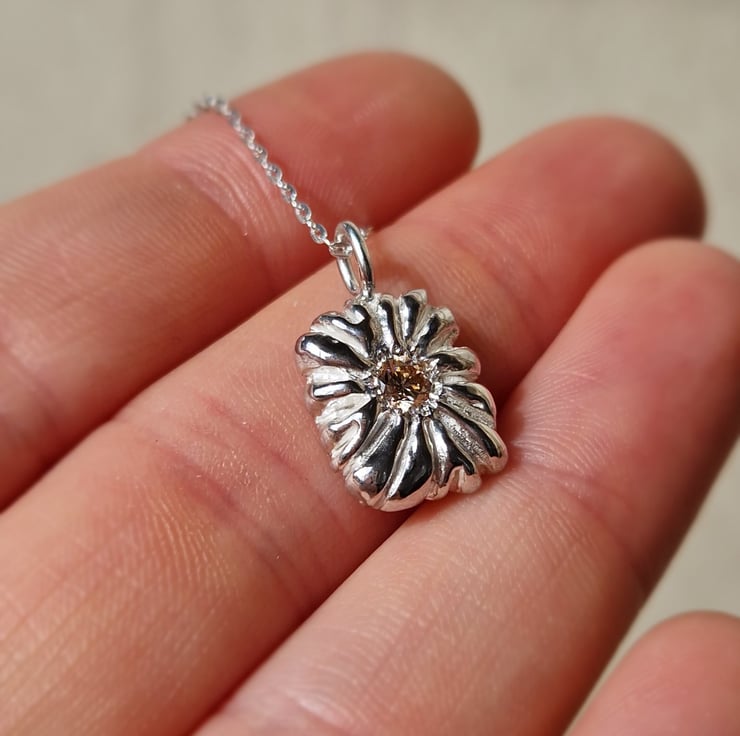 The Talisman is hand carved in wax before being cast in solid sterling silver and finished by hand. The engraved lines radiate outwards like soft rays, while a warm-toned Cubic Zirconia sits at the centre, held within the metal.