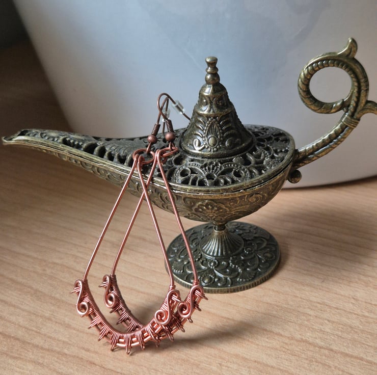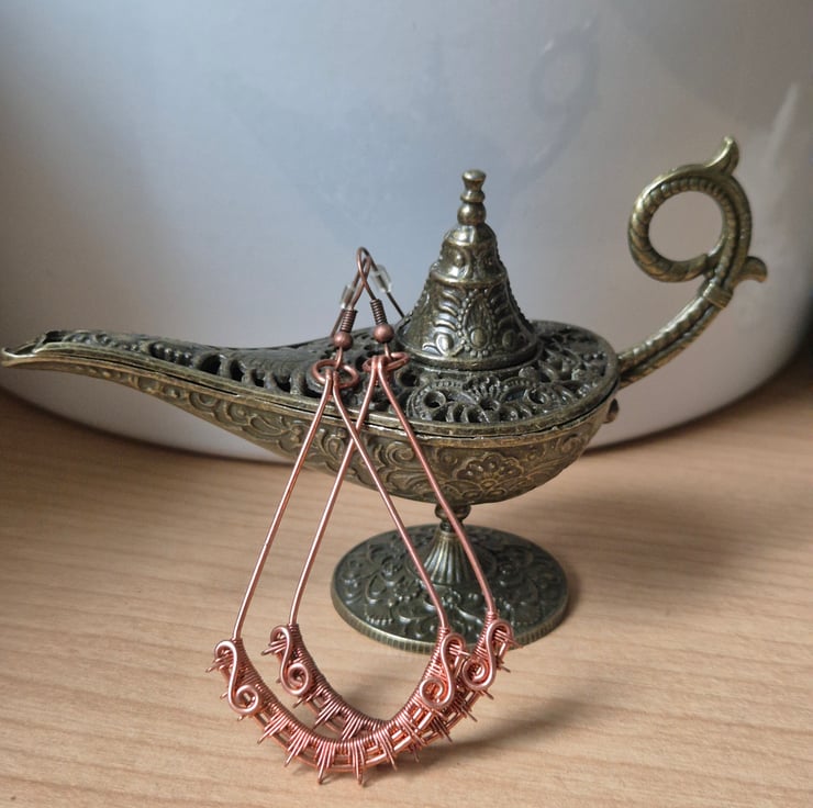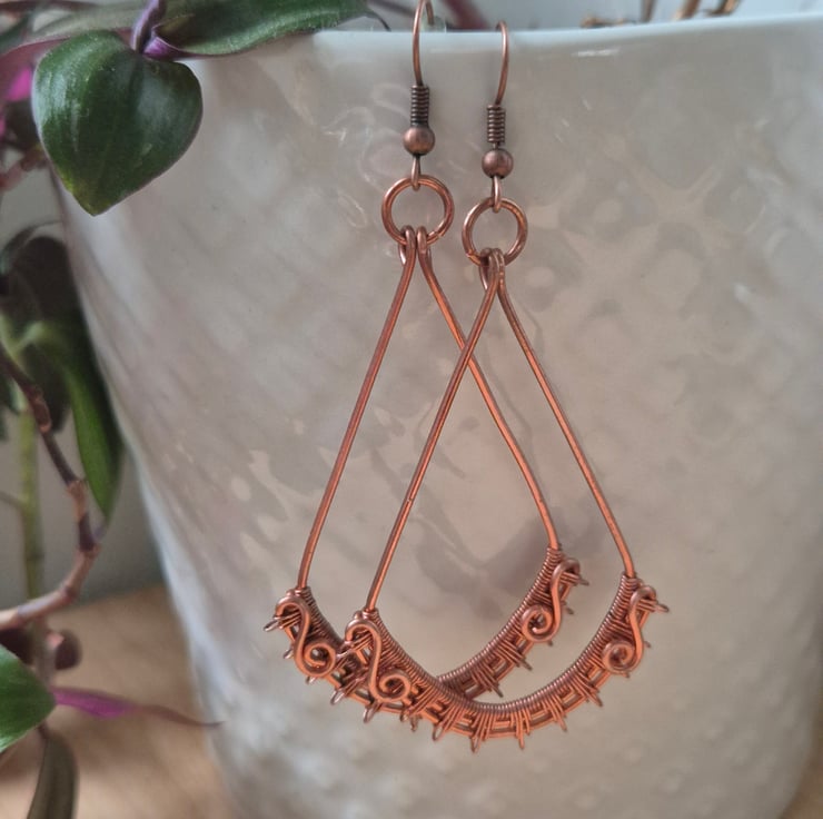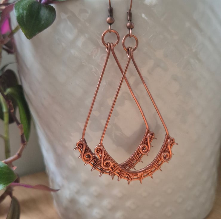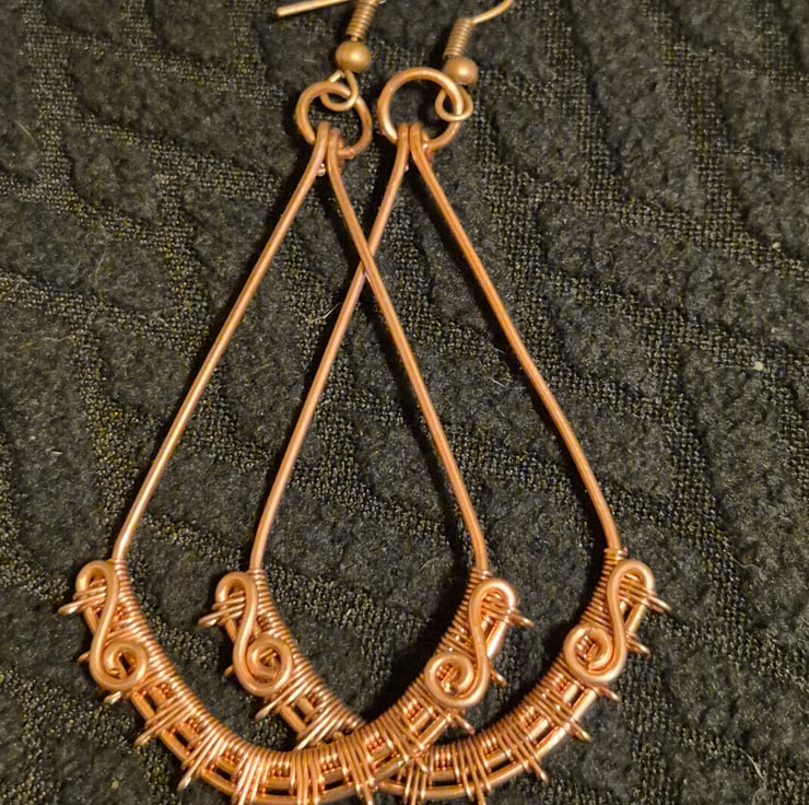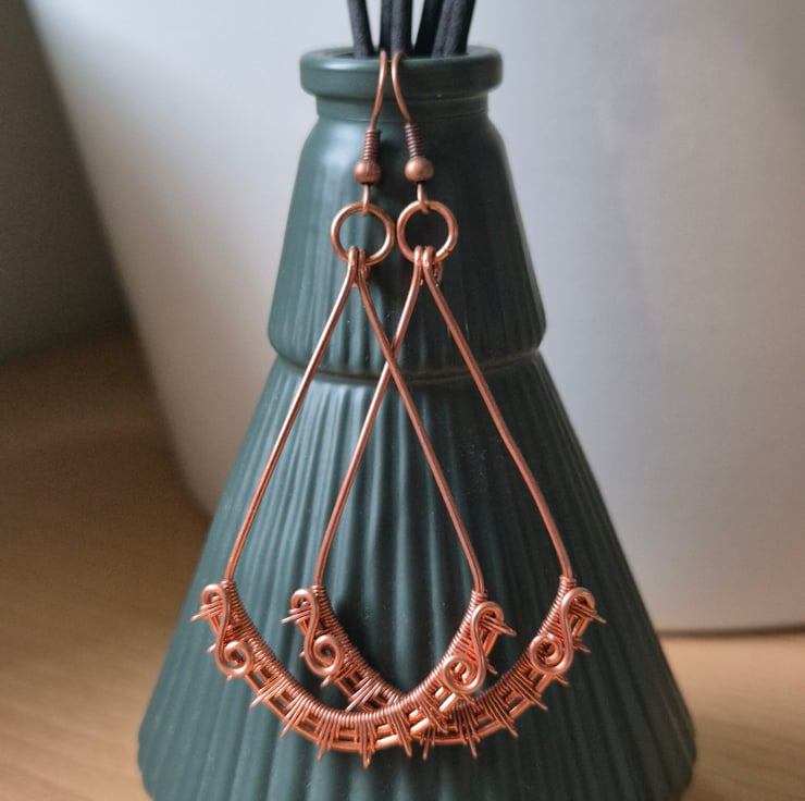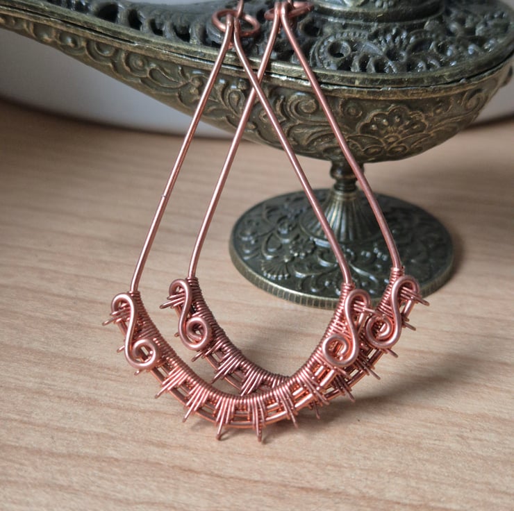 Handmade earrings in a Sun Ray design, I have used copper wire, I have hand weaved and wrapped to achieve this design, featuring a teardrop or crescent shaped base with a loop detail fringe. These will arrive with the clear backs shown in my photos.