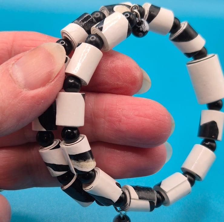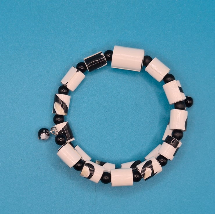 A bracelet made with repurposed black and white wall paper which was cut into strips, rolled into beads which were then varnished. Threaded on a memory wire interspersed with round black recycled beads.Please note that, as I work with recycled paper, and with whatever design is on the paper, the beads are not identical.