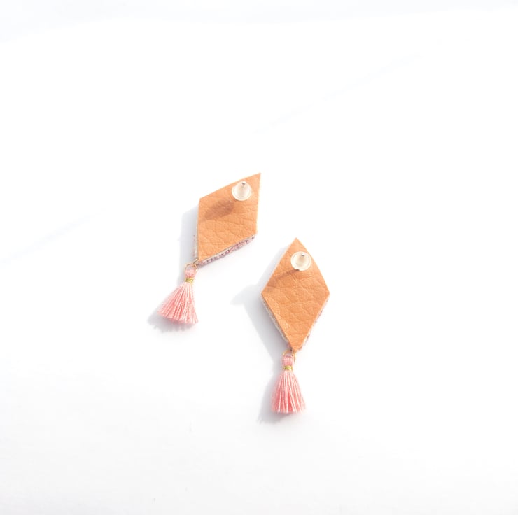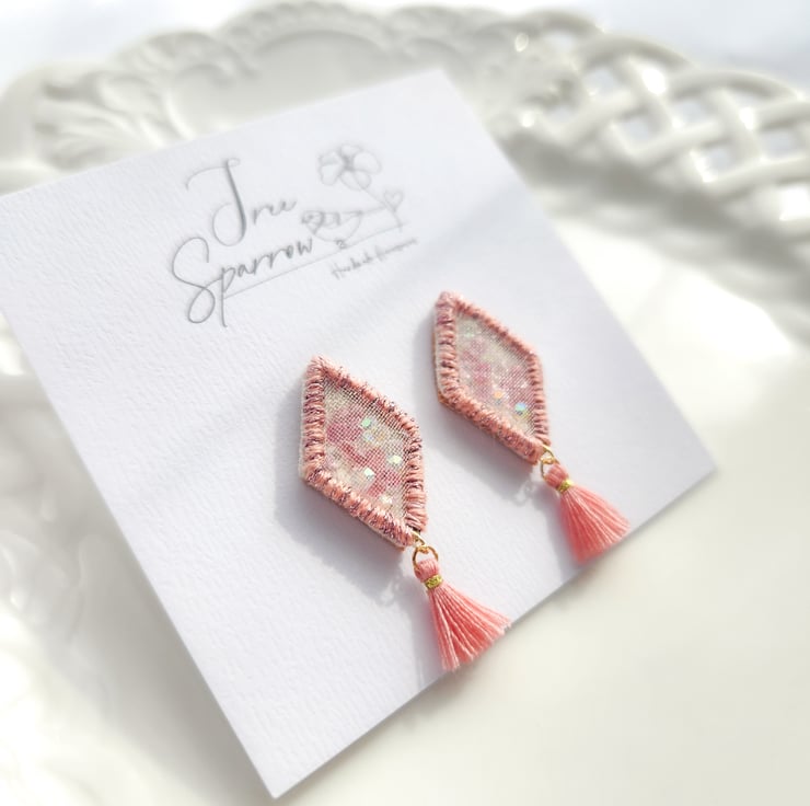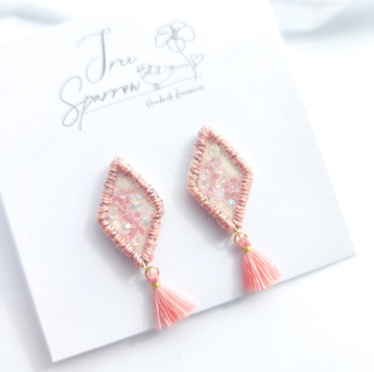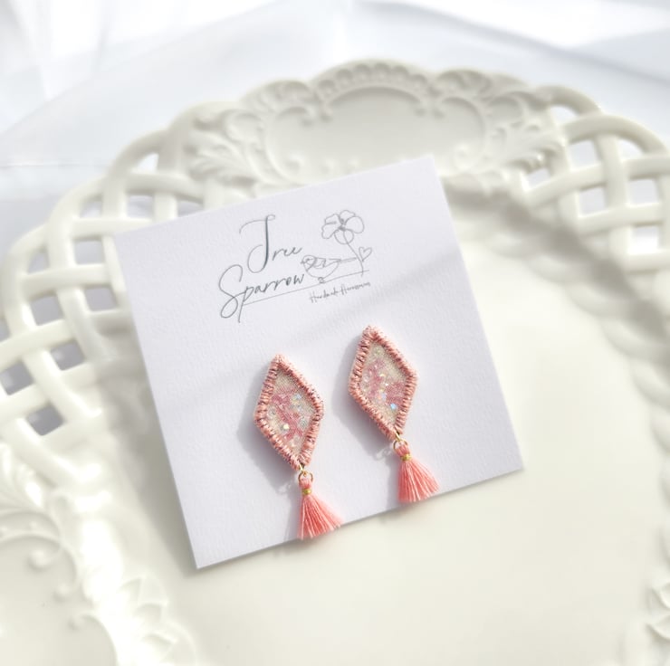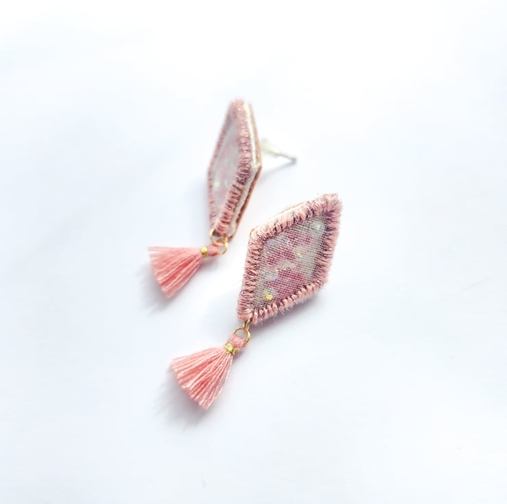 A pair of handmade embroidered earrings featuring a soft geometric shape and delicate textile destails.