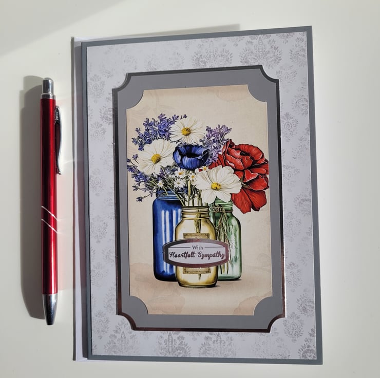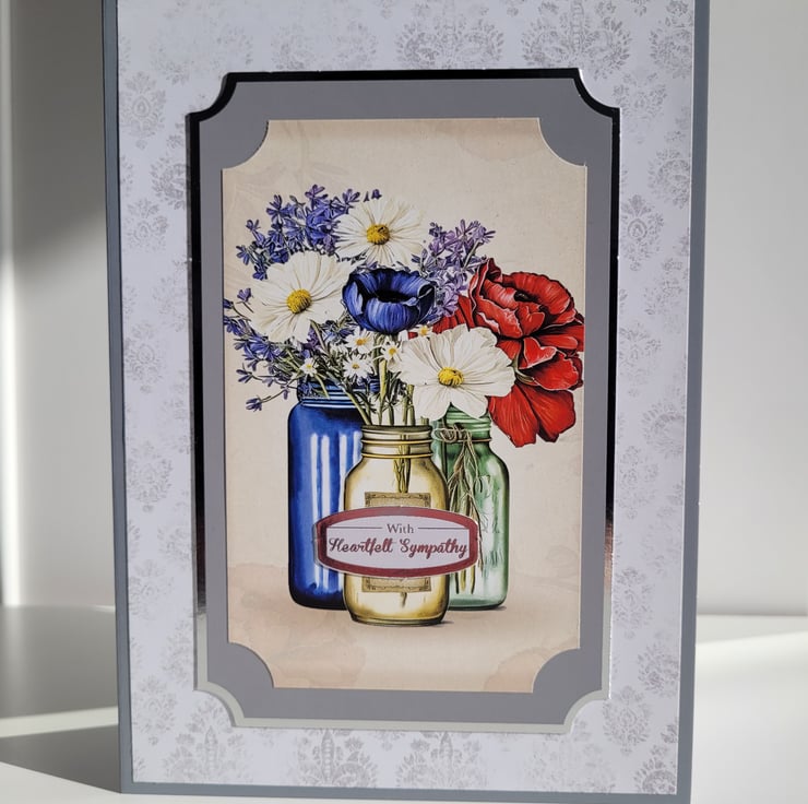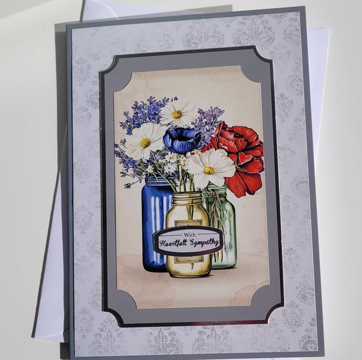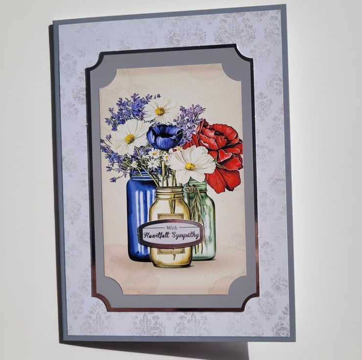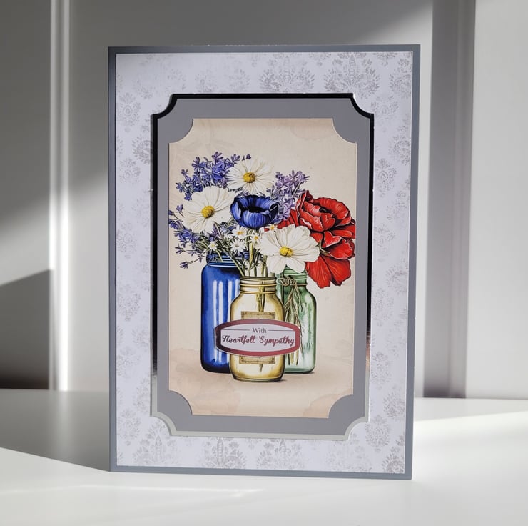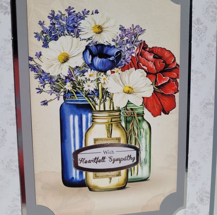 Featuring a tasteful arrangement of wildflowers in classic glass jars and a soft neutral colour palette, this card is thoughtfully designed to express condolences in a respectful and understated way—especially suitable for a male recipient.