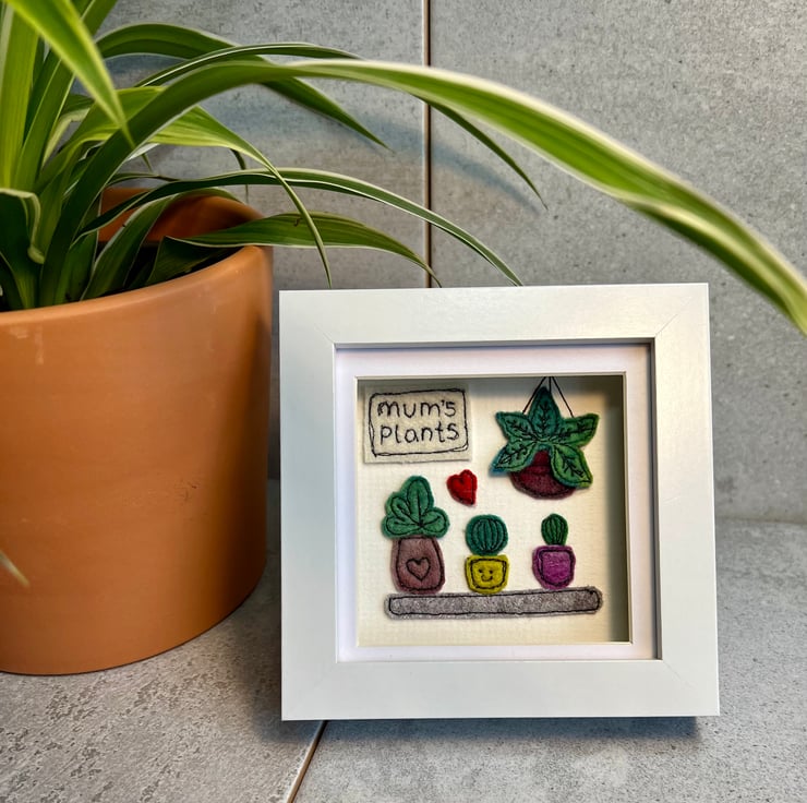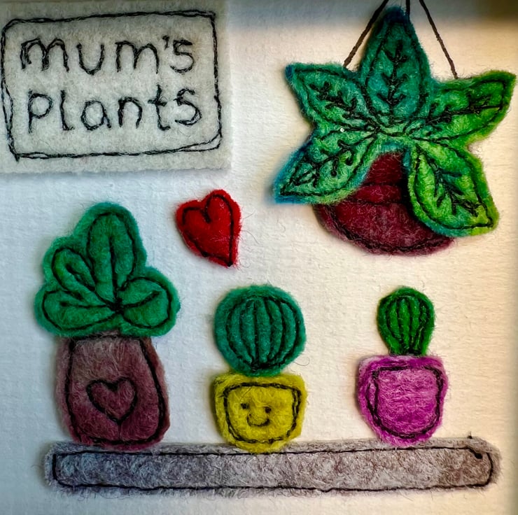 Mini felt picture of plants on shelf, made from my own felted wool and drawn on designs by free motion stitching.