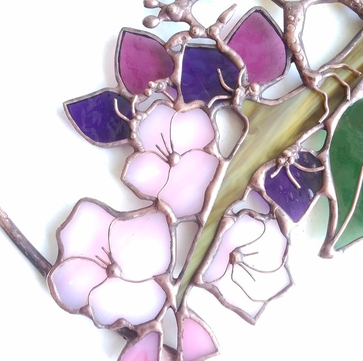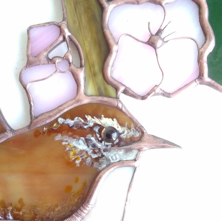 Hand-crafted from a selection of of the highest quality stained art glass, this large copper ring design combines modern decorative soft solderwork and hand-hewn copper foliage overlays, with the traditional Tiffany copper foil technique, to create a totally unique, contemporary stained glass panel. Mottled toffee brown Youghiogheny glass and textured cream opal glass accentuated with delicately hand-painted enamel and wirework details to bring this tiny songstress of Spring to life. Wissmach seville olive green leaves and corella mauve berries compliment the delicate powder pink blossoms to complete the composition.