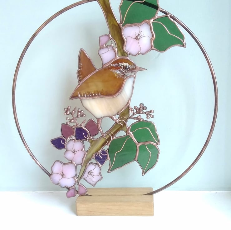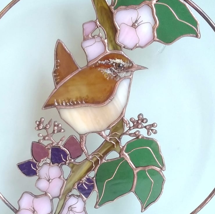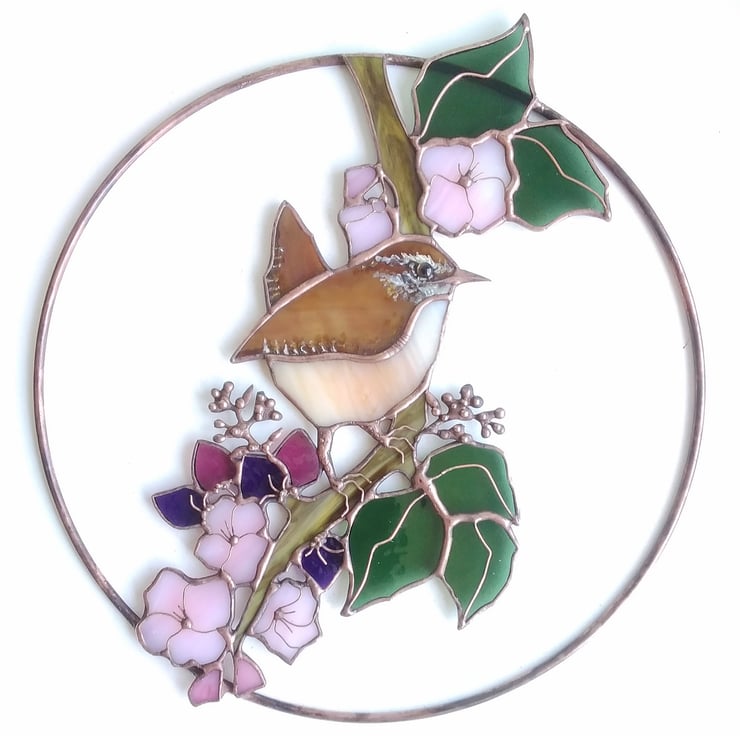 Large stained glass ring depicting one of Britain's most-beloved songbirds, the Jenny wren. Set amidst clusters of soft pink blossom and shiny berries offset with copper details.