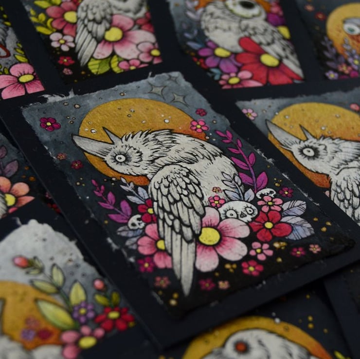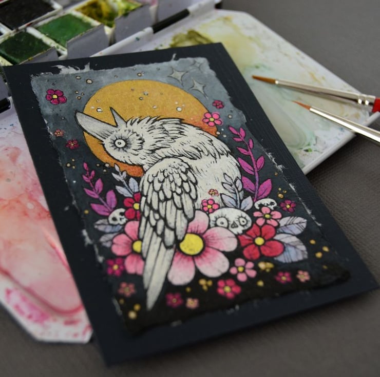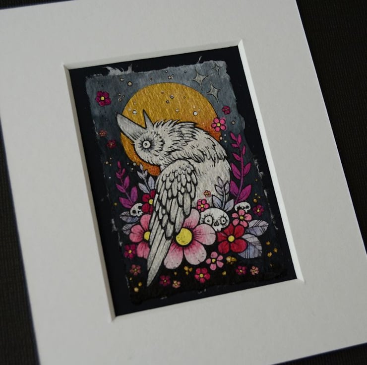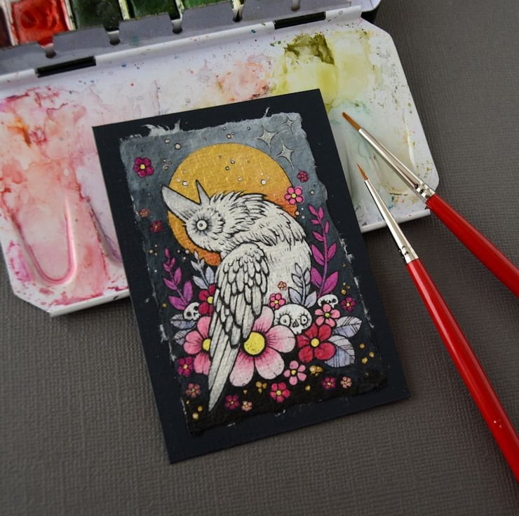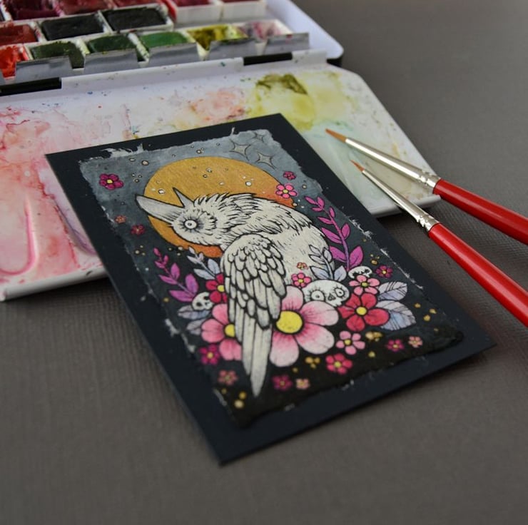 this aceo is an original artwork, hand drawn with a tiny 0.05 nibbed pen, then coloured with ink, artists pens and watercolour paints, on indian khadi paper. khadi paper is handmade from recycled cotton rag, it has a lovely textured surface and deckled edges. i have then mounted the illustration onto 300gsm cardstock, hand painted with a paynes grey to create a dark surrounding edge/background.