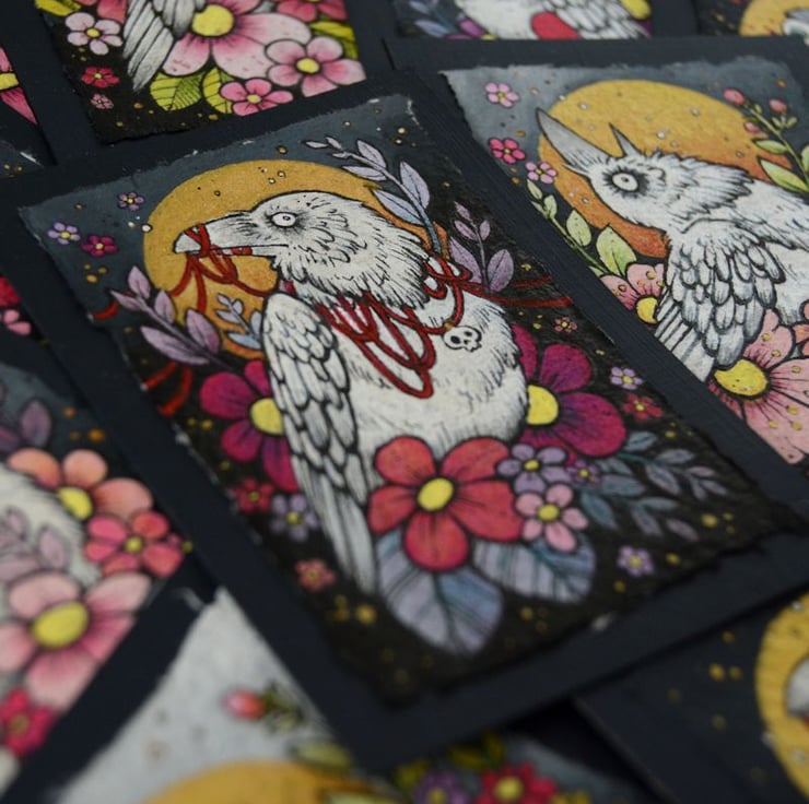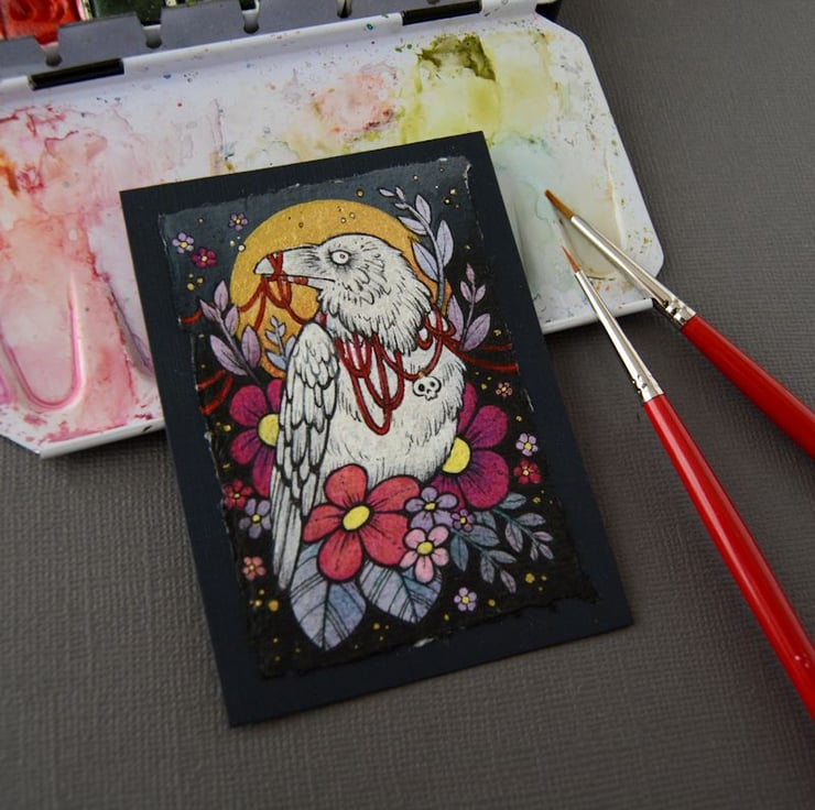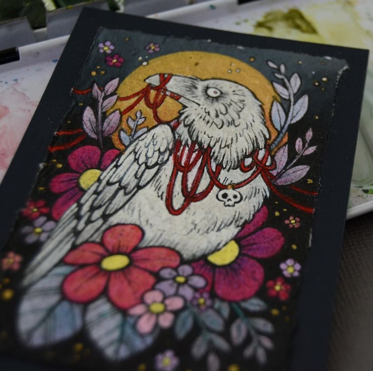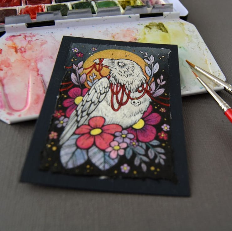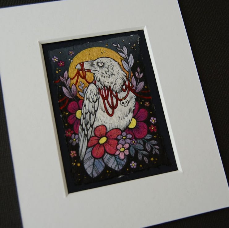 this aceo is an original artwork, hand drawn with a tiny 0.05 nibbed pen, then coloured with ink, artists pens and watercolour paints, on indian khadi paper. khadi paper is handmade from recycled cotton rag, it has a lovely textured surface and deckled edges. i have then mounted the illustration onto 300gsm cardstock, hand painted with a paynes grey to create a dark surrounding edge/background.