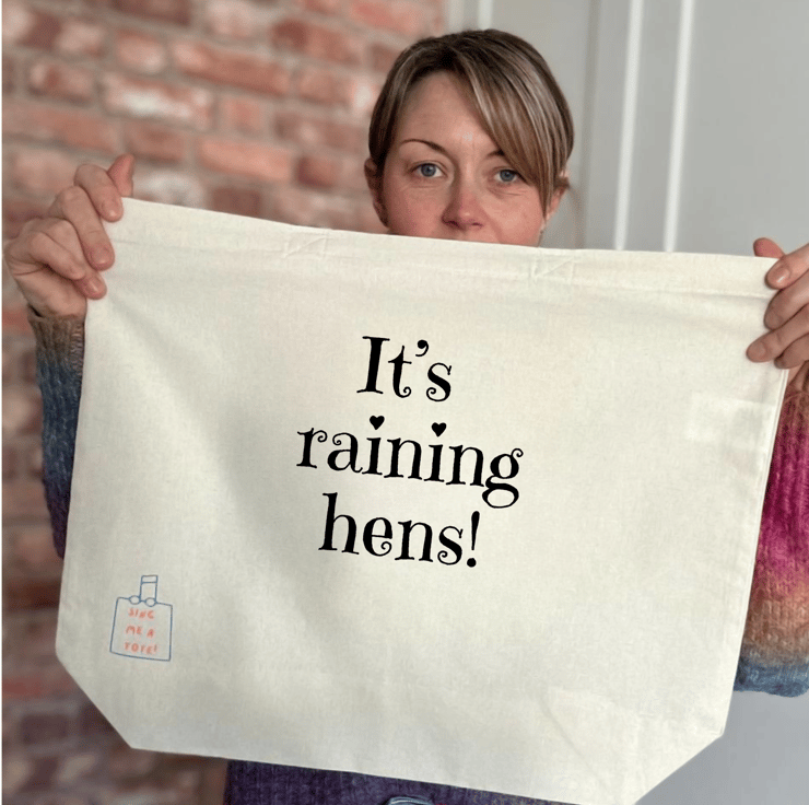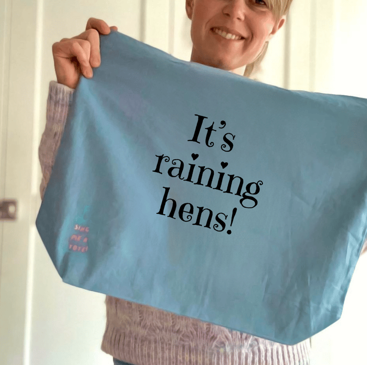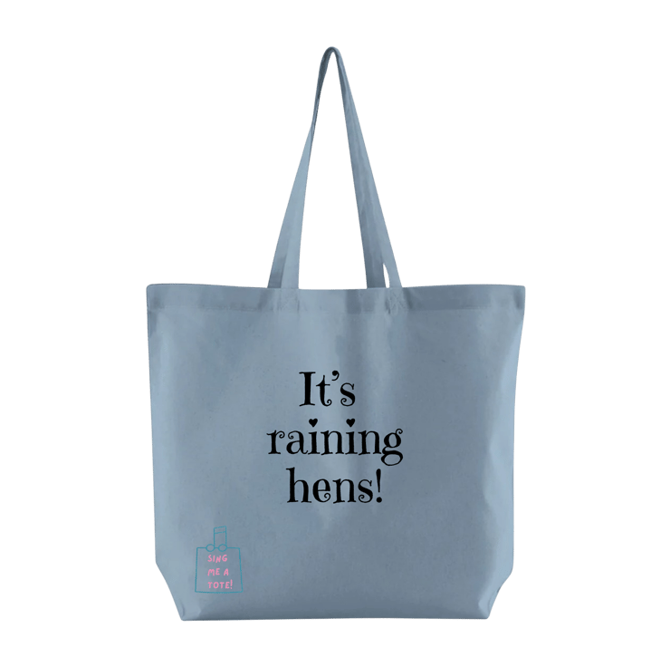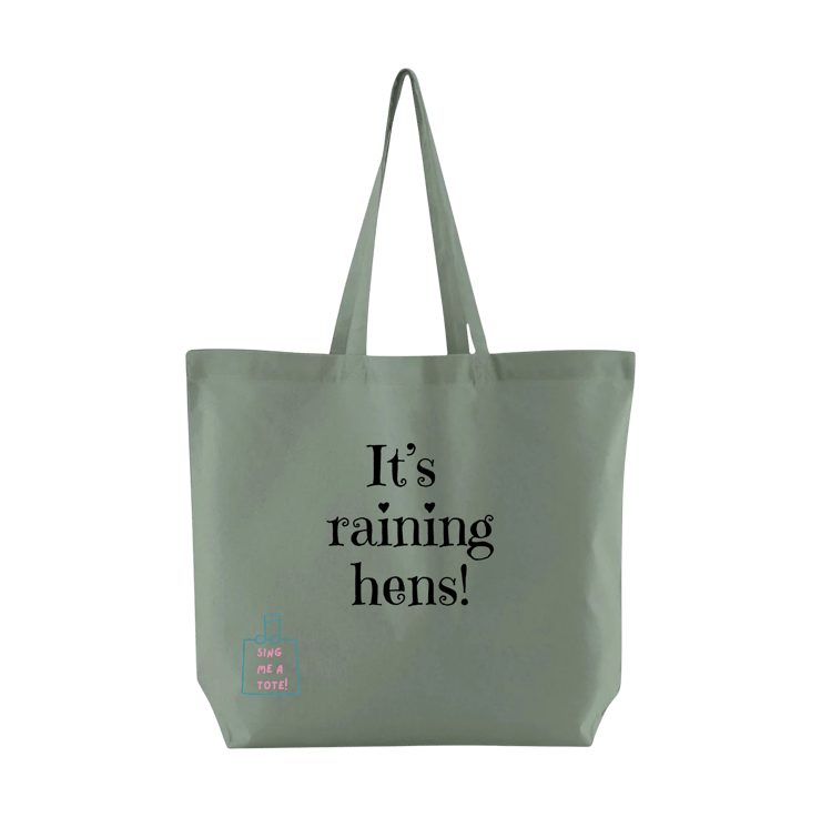 This 'It's raining hens' cotton tote bag is a generous 35x39x13.5 cm with a capacity of 18litres - perfect for keeping your items all together while on the move or out for a picnic!