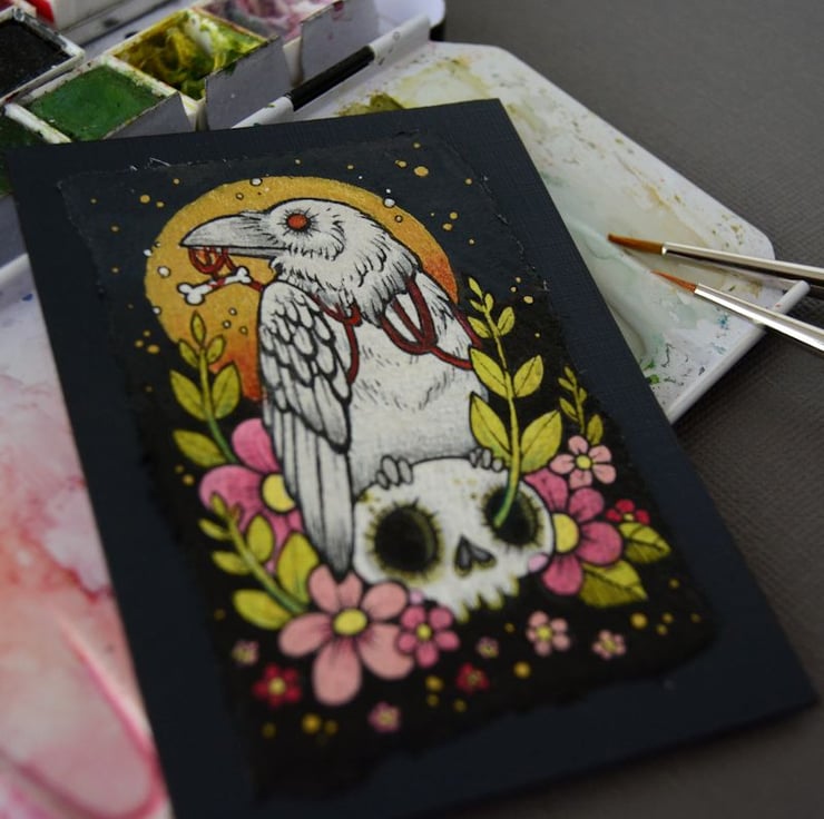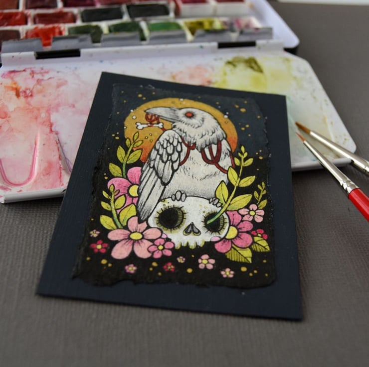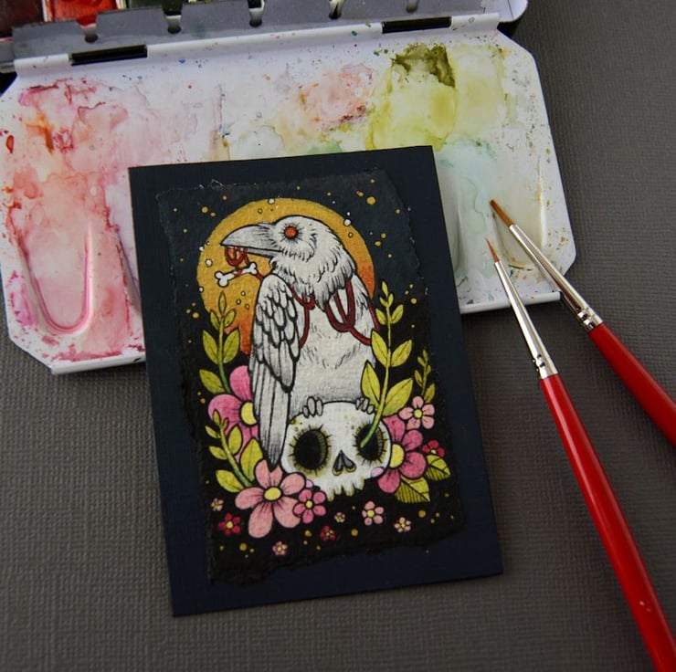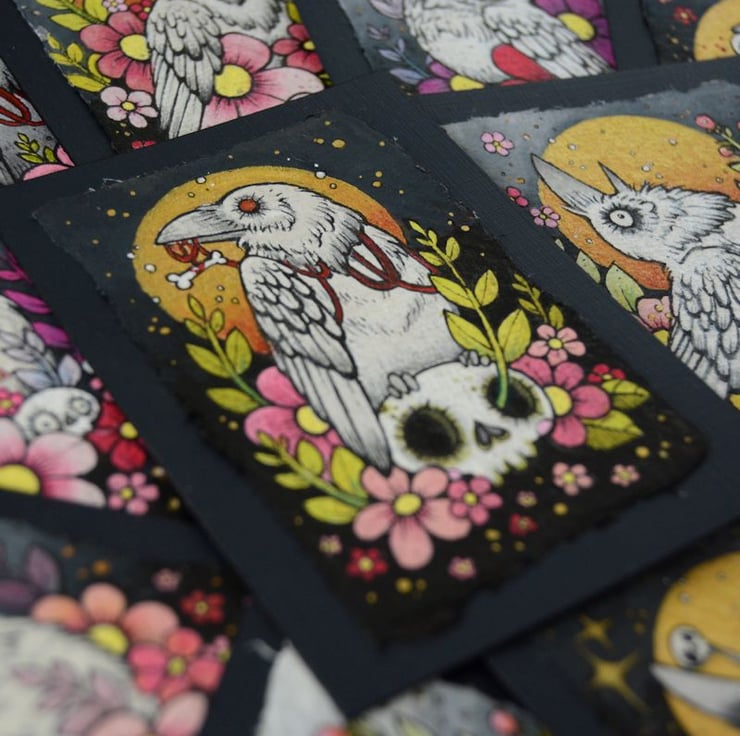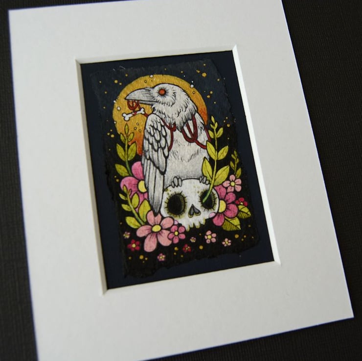 this aceo is an original artwork, hand drawn with a tiny 0.05 nibbed pen, then coloured with ink, artists pens and watercolour paints, on indian khadi paper. khadi paper is handmade from recycled cotton rag, it has a lovely textured surface and deckled edges. i have then mounted the illustration onto 300gsm cardstock, hand painted with a paynes grey to create a dark surrounding edge/background.