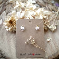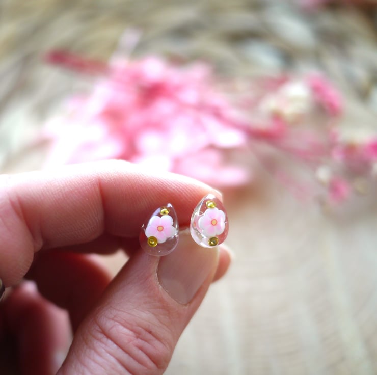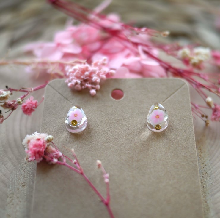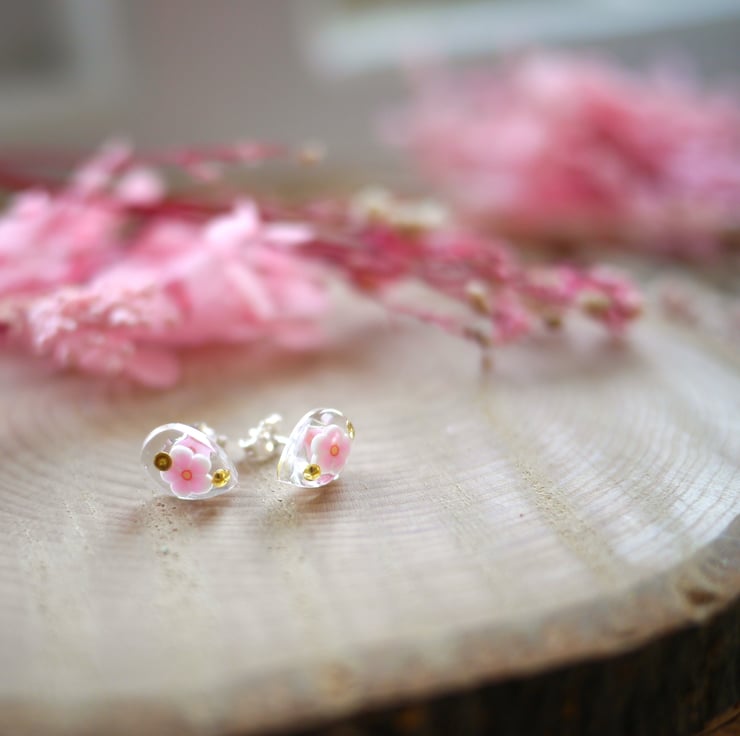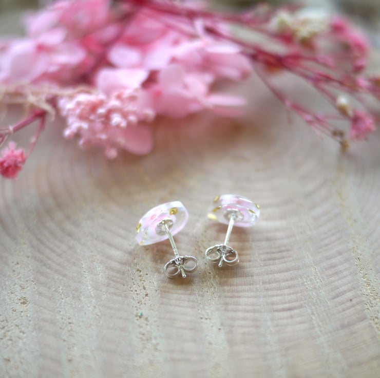 I have cast tiny gold gems and pink polymer clay flowers in each stud with clear resin. The posts and backs are sterling silver for those with sensitive ears (like me!) so they are hypoallergenic for everyone. These studs are perfect for everyday use.