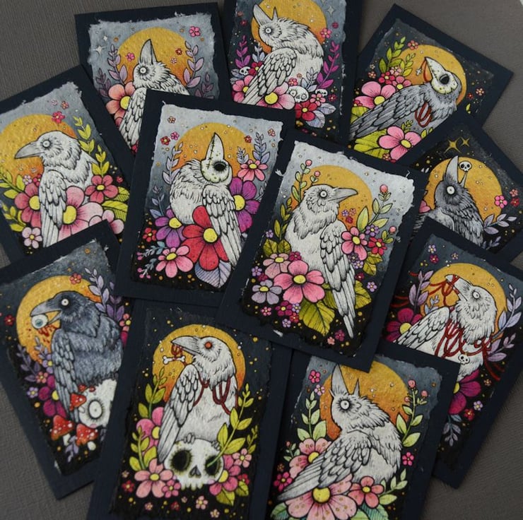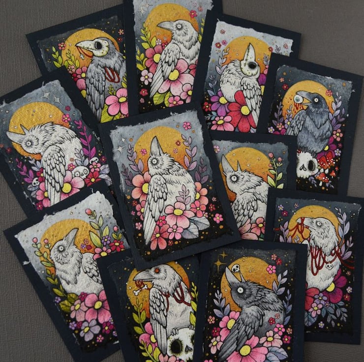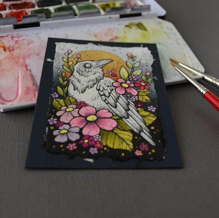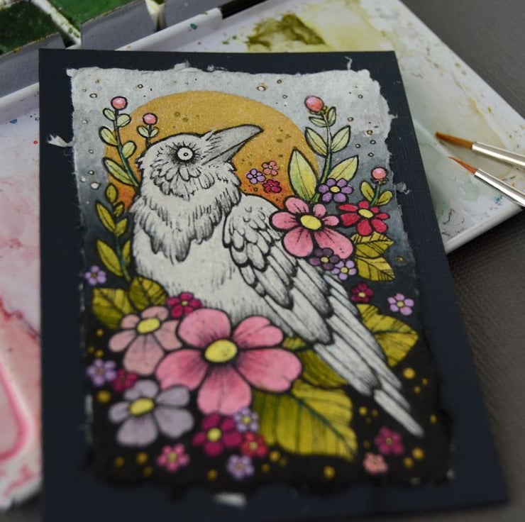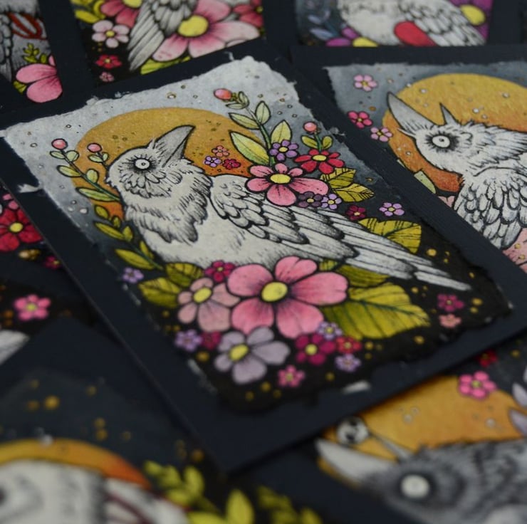 this aceo is an original artwork, hand drawn with a tiny 0.05 nibbed pen, then coloured with ink, artists pens and watercolour paints, on indian khadi paper. khadi paper is handmade from recycled cotton rag, it has a lovely textured surface and deckled edges. i have then mounted the illustration onto 300gsm cardstock, hand painted with a paynes grey to create a dark surrounding edge/background.