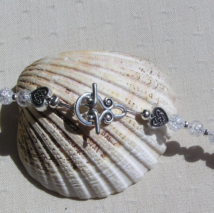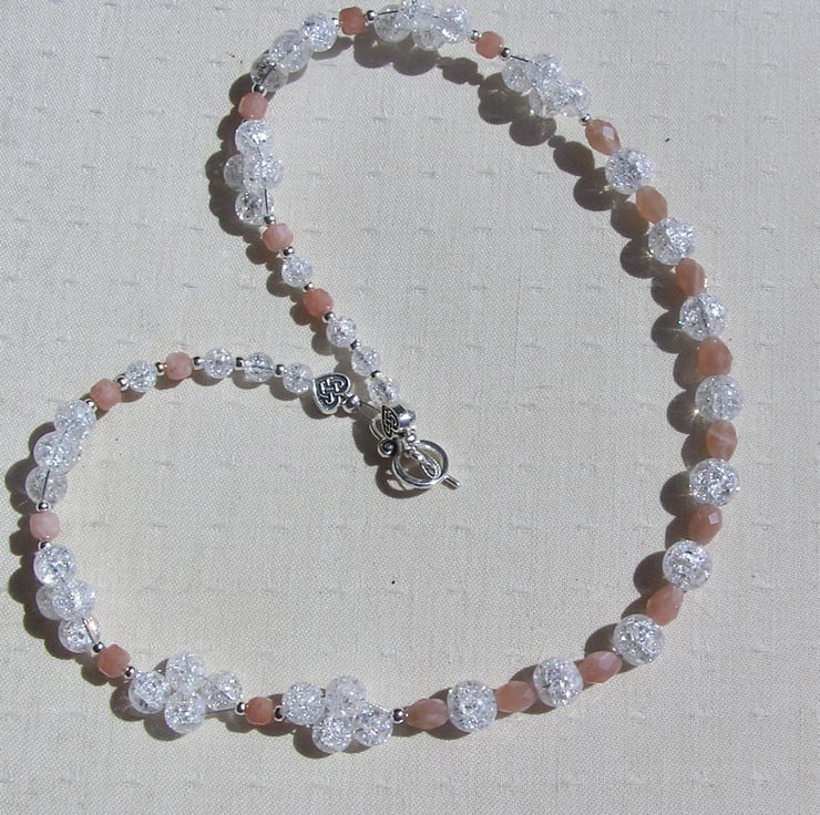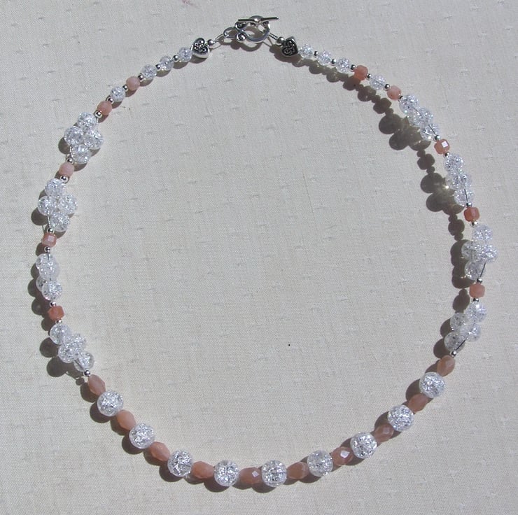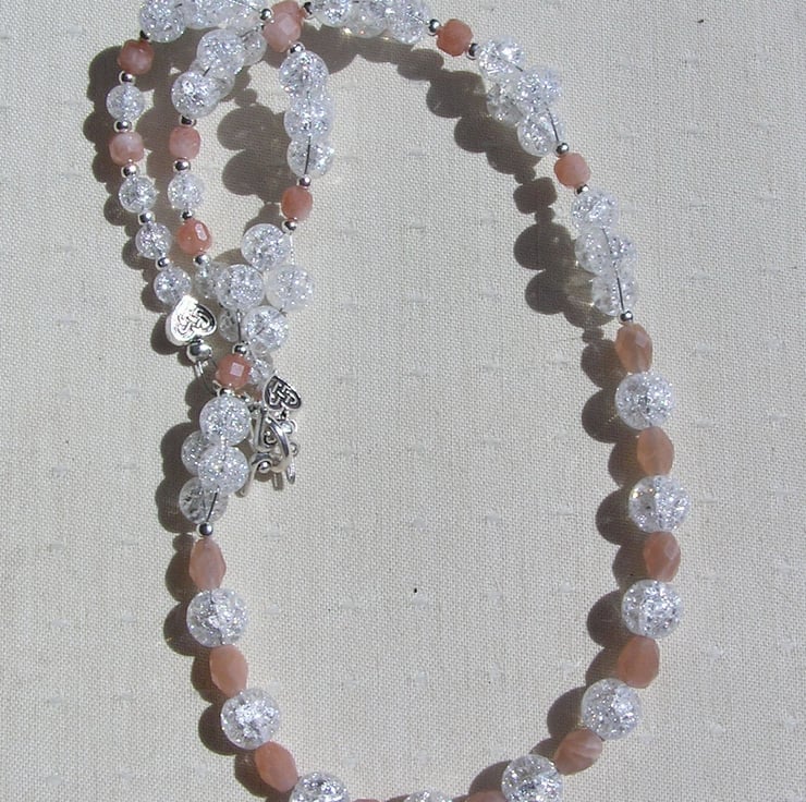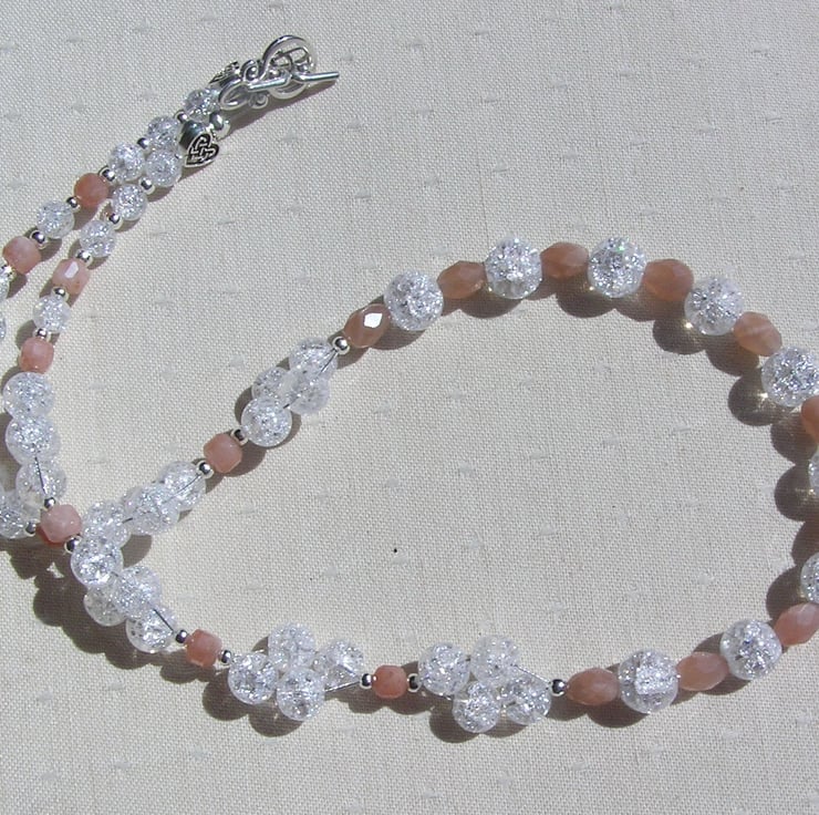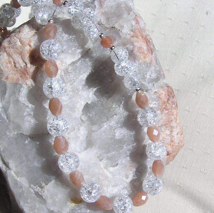 This Stunning Sumptuous Necklace is made from alternating Peach Sunstone ‘Barrel’ shaped beads and Crackled Clear Quartz large round beads this then flows into slightly smaller Crackled Clear Quartz beads this time clustered together in four’s again alternated with Peach Sunstones beads - a Gorgeous Sparkling combination that will look stunning either worn casually or with something more Elegant for a Special Evening out