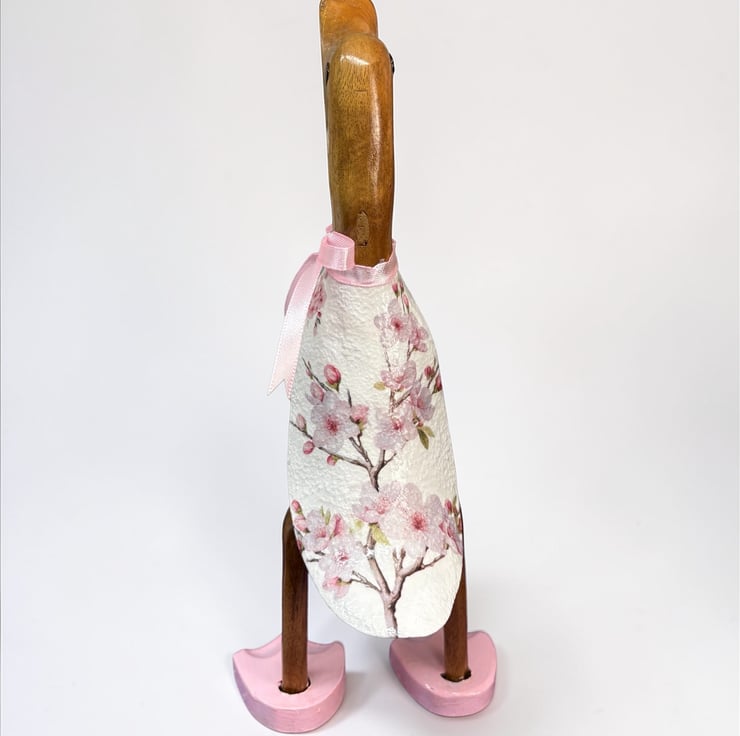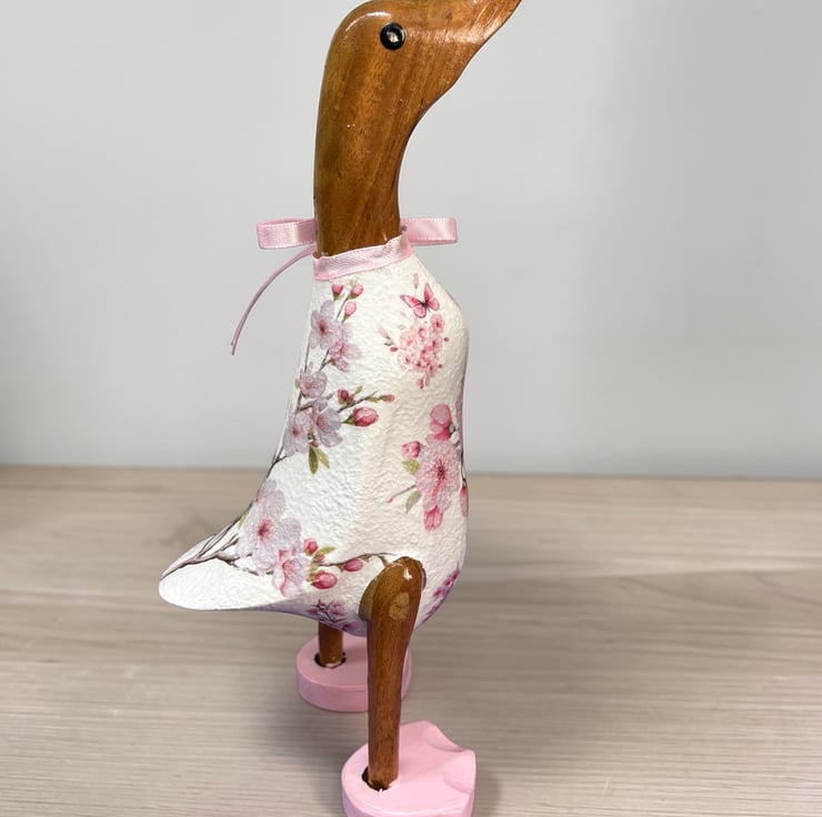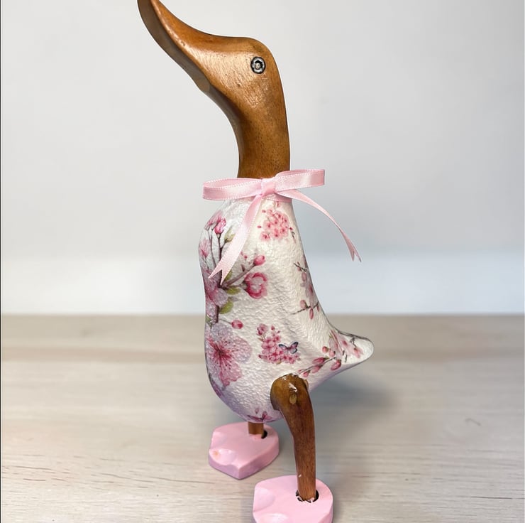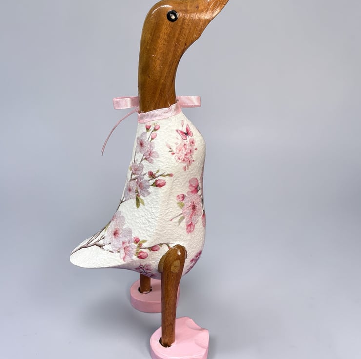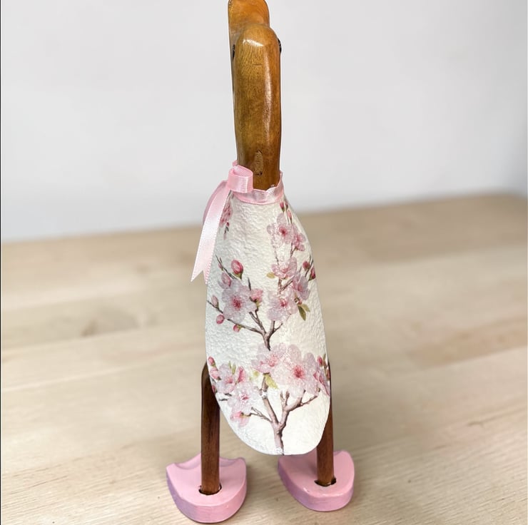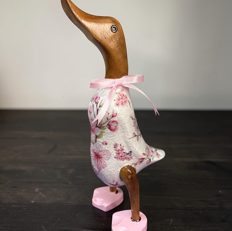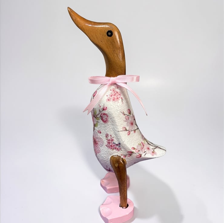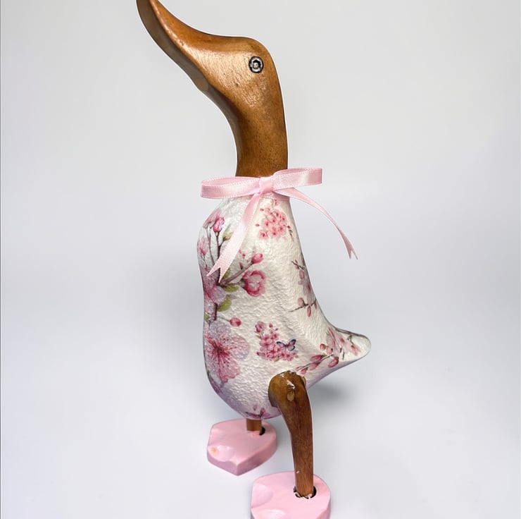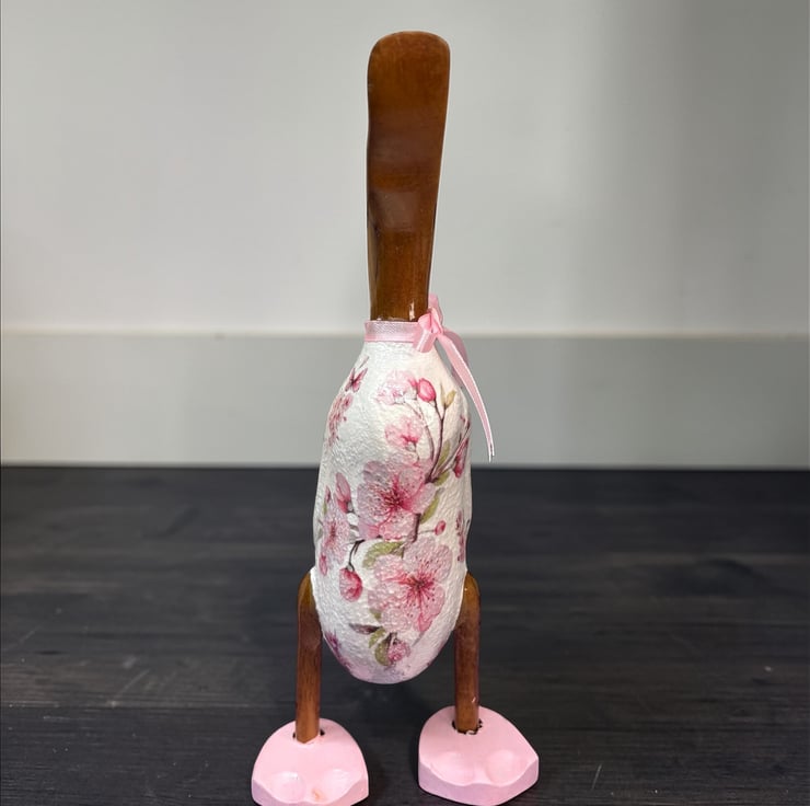 This bamboo duck (approx 23cm) has been hand painted and then decoupaged using paper featuring cherry blossom. “Cherry” has been finished off with a lovely pink ribbon tied into a bow around her neck.