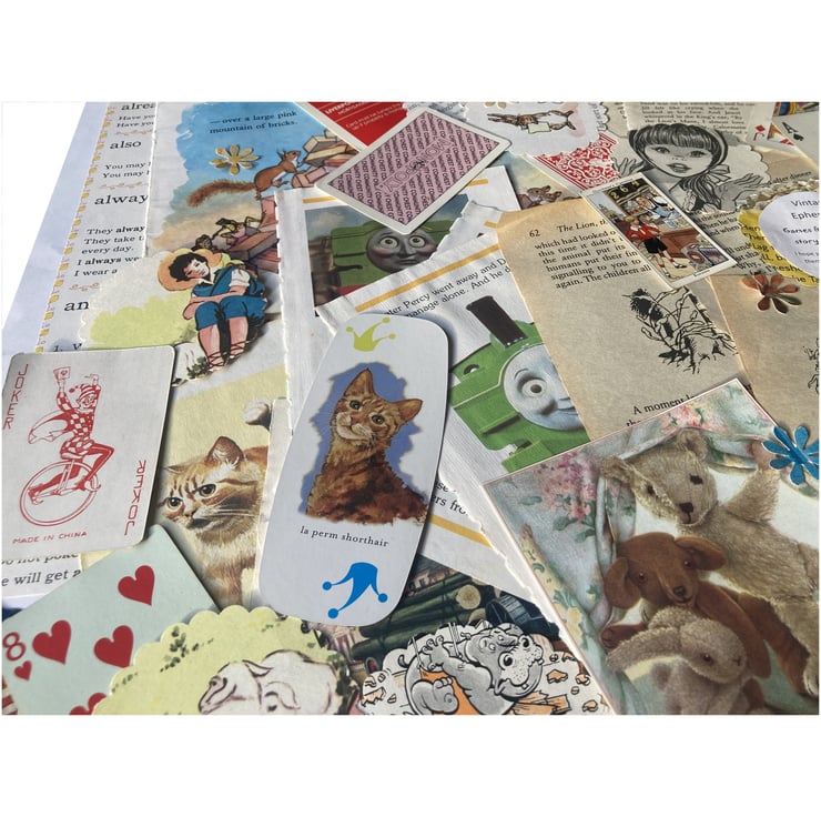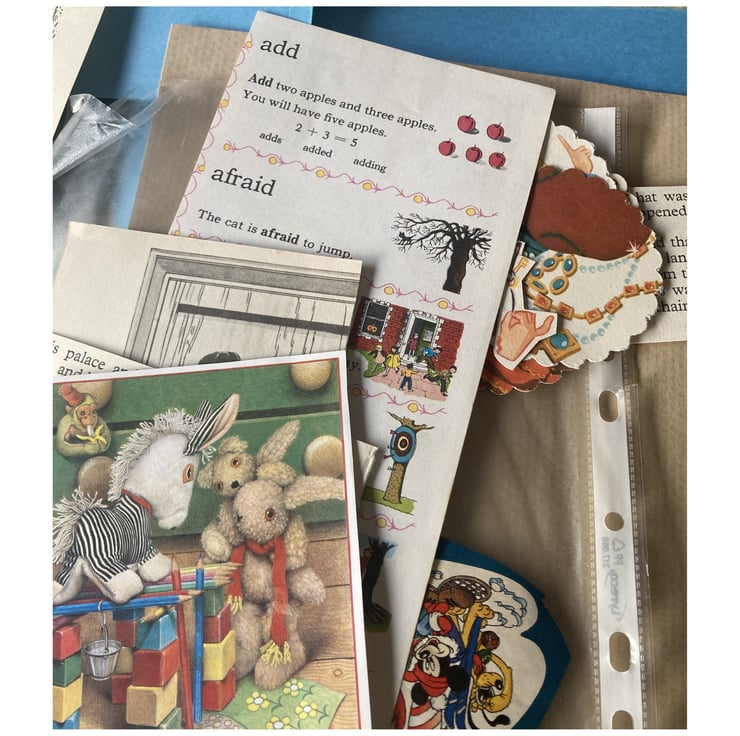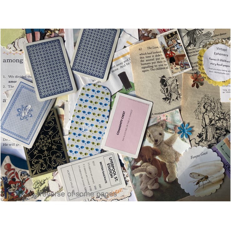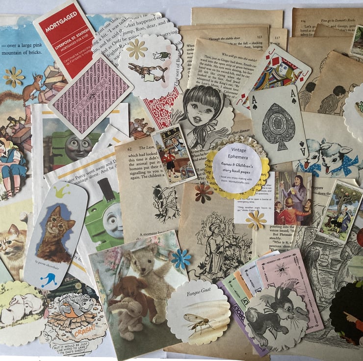 Vintage ephemera story books pages and games, scrap book, collage, mixed media.