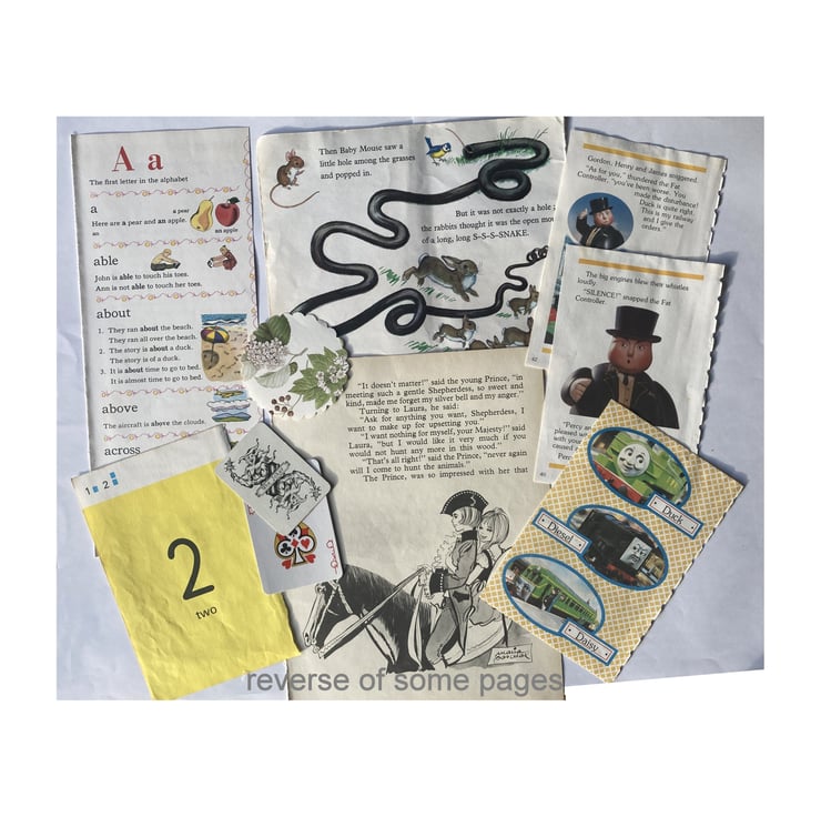 A picture dictionary page, large illustrated storybook page and smaller page from a vintage “molly Brett “ story, ladybird books –a counting page and 3 Thomas the tank pages, small Thomas the tank pages, and an “old bear “illustration. There are 2 illustrated and 2 text pages from Famous Five”(Demons Rocks), 2 large paperback Narnia pages (The Lion, the witch and the Wardrobe-2 text, 2 with drawings) plus 5 smaller text pages (“the last battle”) and 3 illustrated “five little peppers” pages.