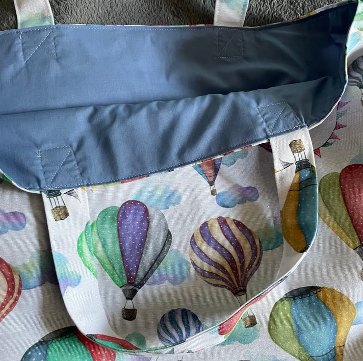 The bag is lined with plain blue poly cotton and has a reinforced stitched bottom. It has handles made from the same outer fabric.