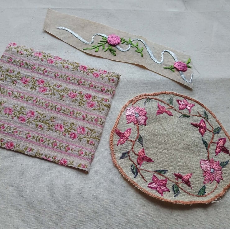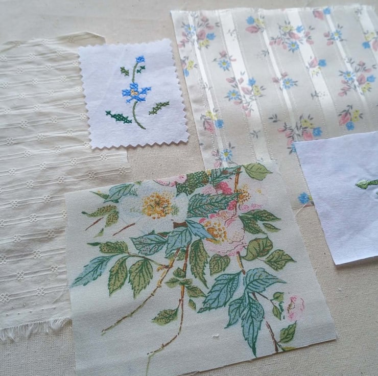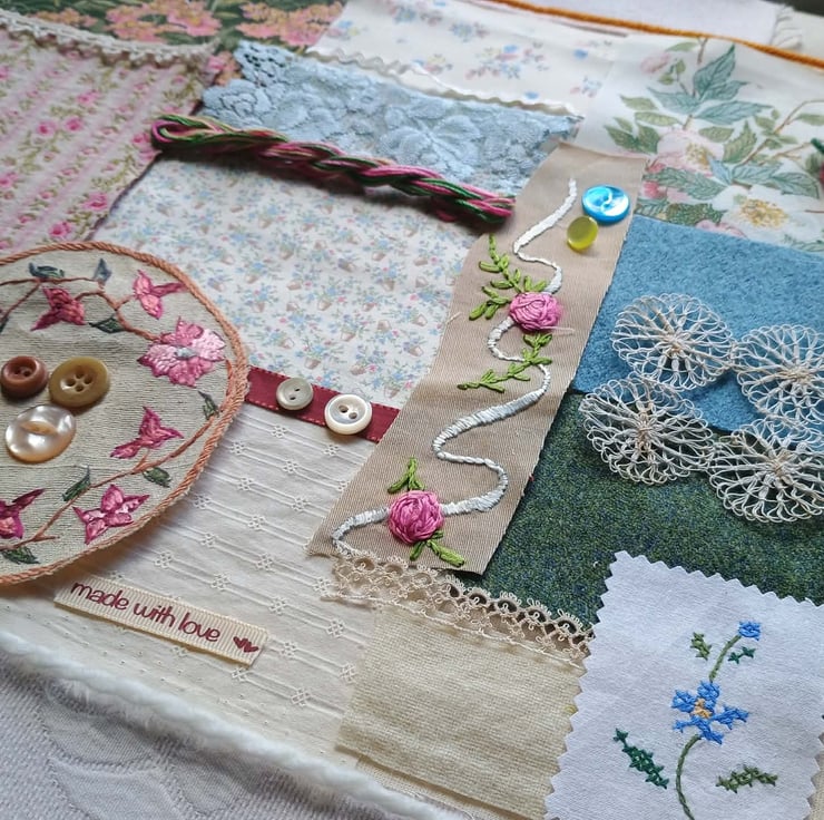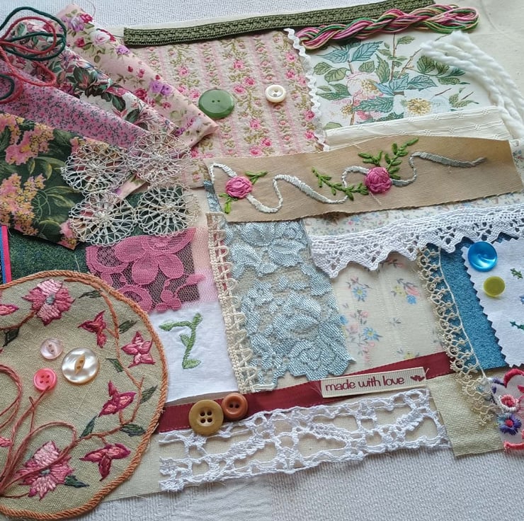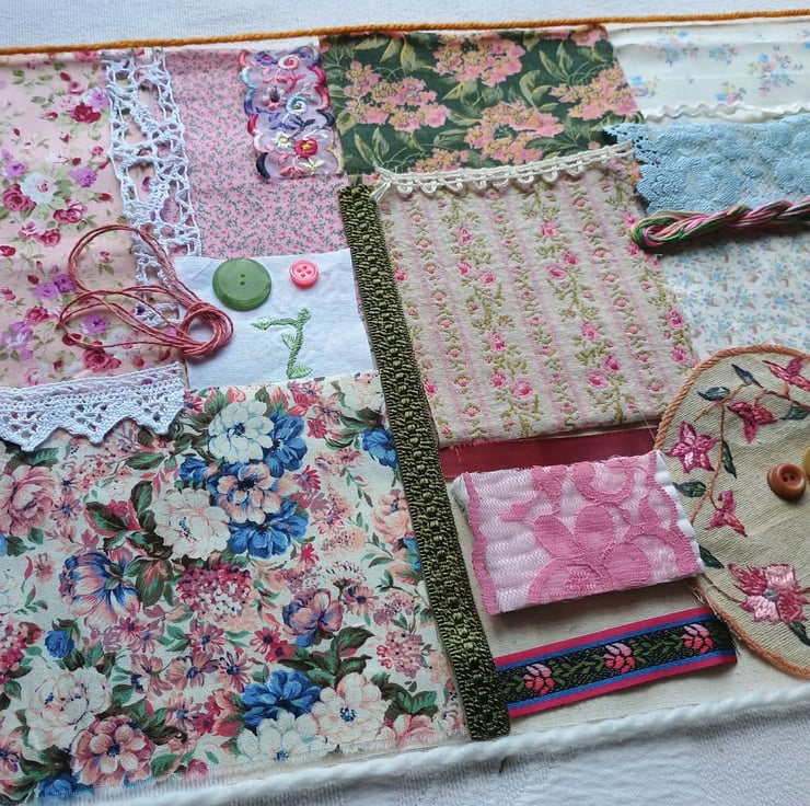 Garden themed craft kit, inspired by a fragment of a vintage hand embroidered rose cushion and a scrap of fabric from the iconic Country Diary of an Edwardian Lady. Pinks, greens and blues, on a background of soft cream, these lovely textiles are ideal for slow stitching, textile art and junk journals. Would make a lovely gift for a crafting friend, or keep for yourself.