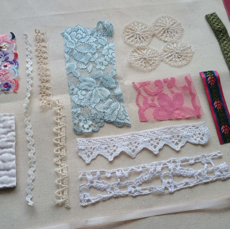 In two sizes, the larger box has more pieces and larger sizes than the starter kit, but both include stunning pieces of antique, vintage and pre-loved textiles and trims chosen to complement and enhance the feature pieces.