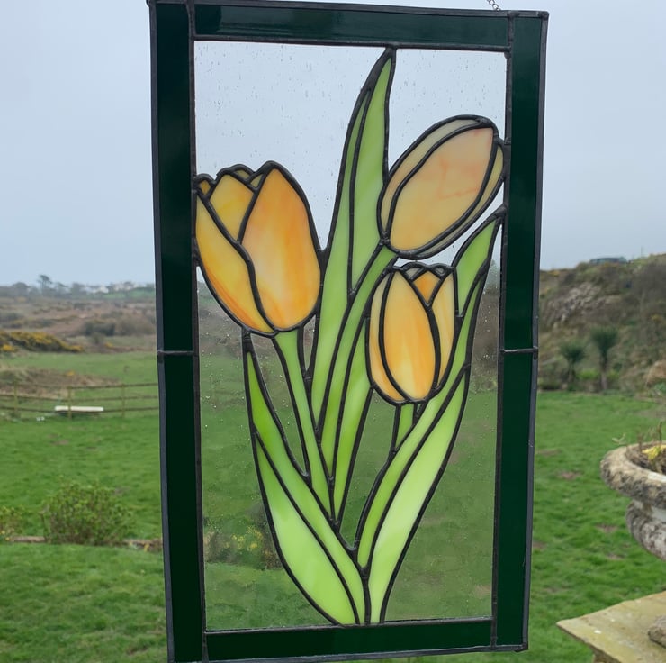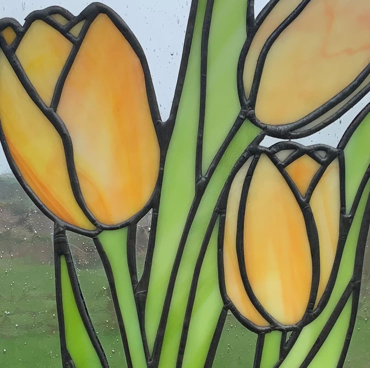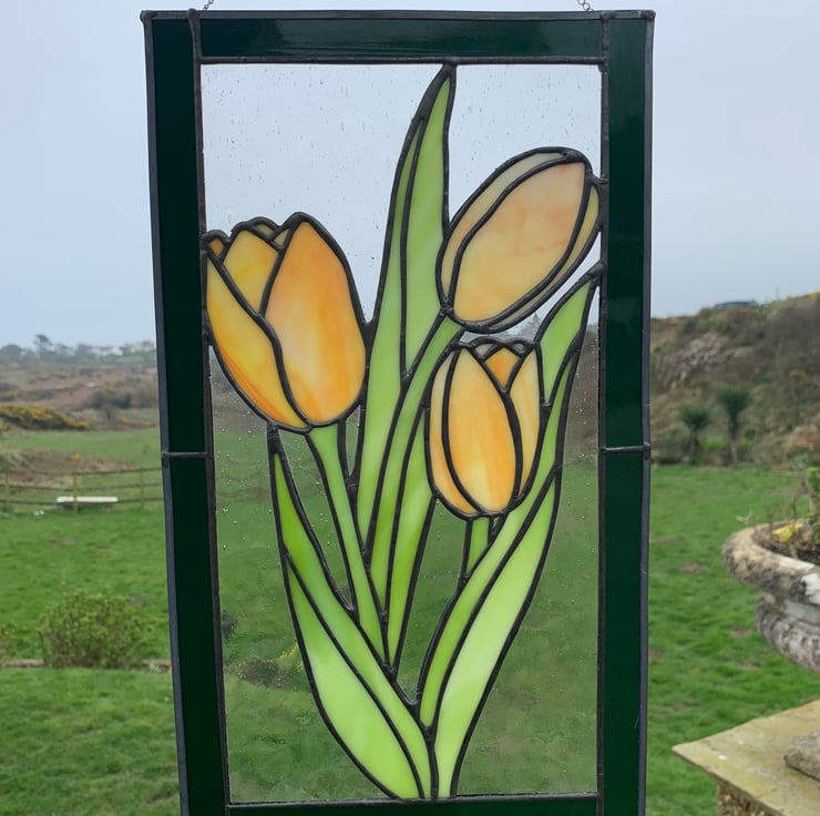 Bring a pop of spring to your window all year round with this stained glass panel of tulips.