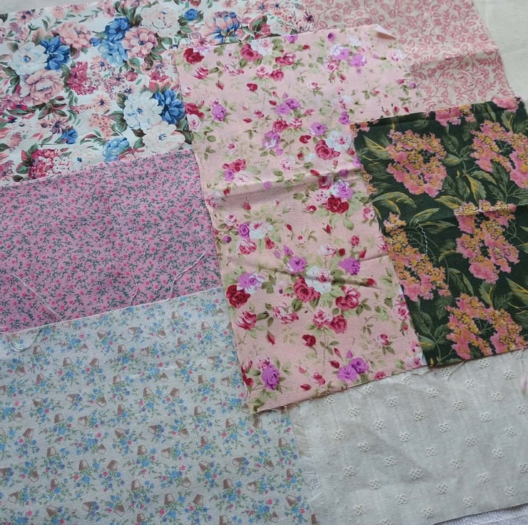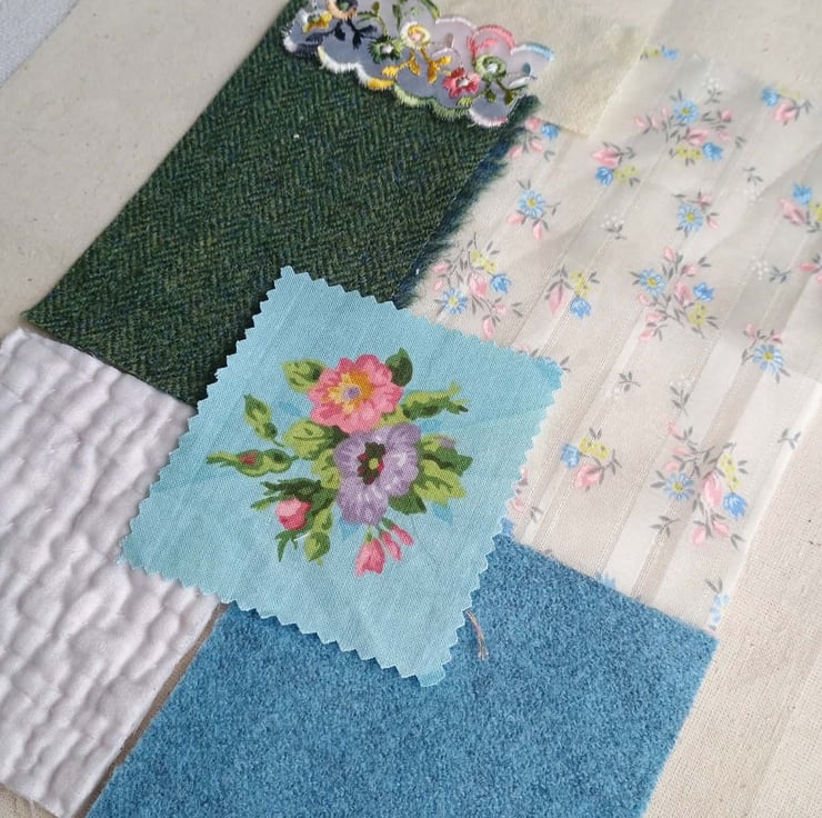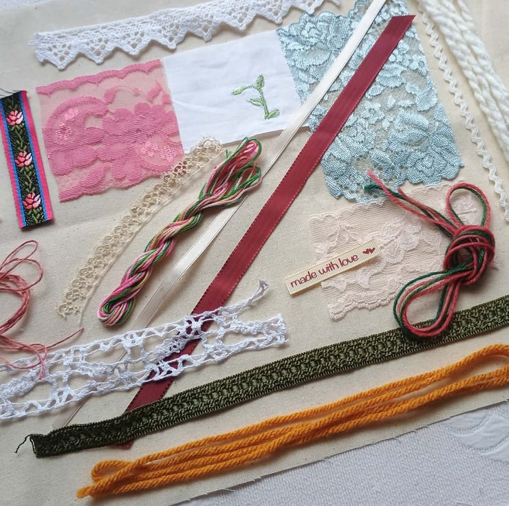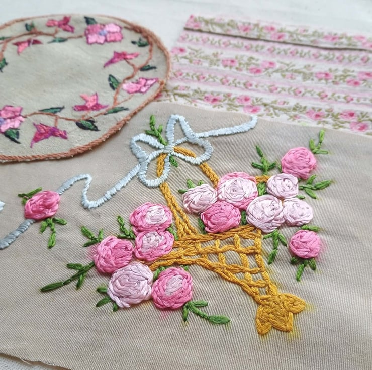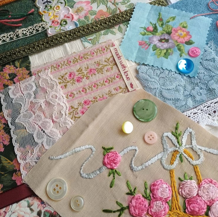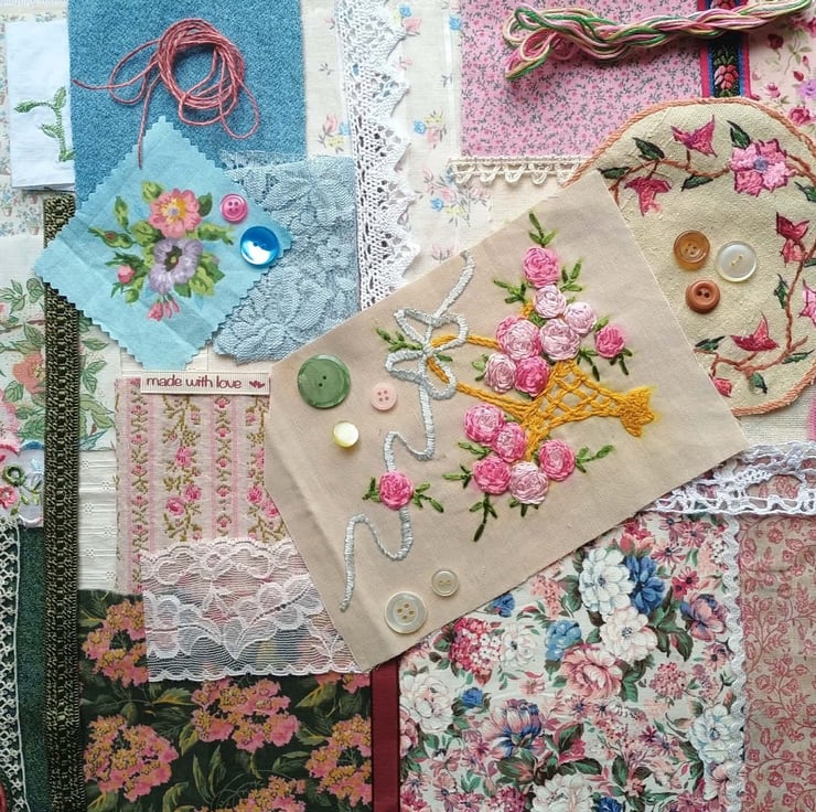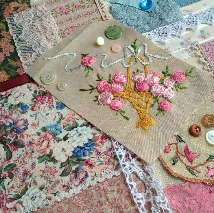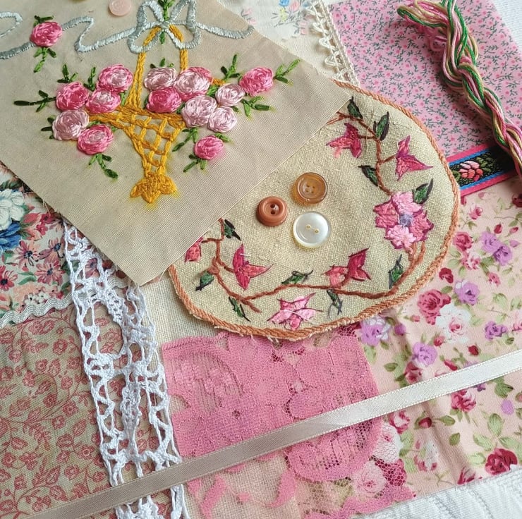 Floral slow stitching kit, inspired by a stunning hand embroidered rose basket from a vintage cushion. In pinks, greens and blues, on a background of rich cream, these lovely textiles are ideal for slow stitching, textile art and junk journals. A lovely gift for a crafting friend, or keep to make a beautiful vintage style art project for yourself.