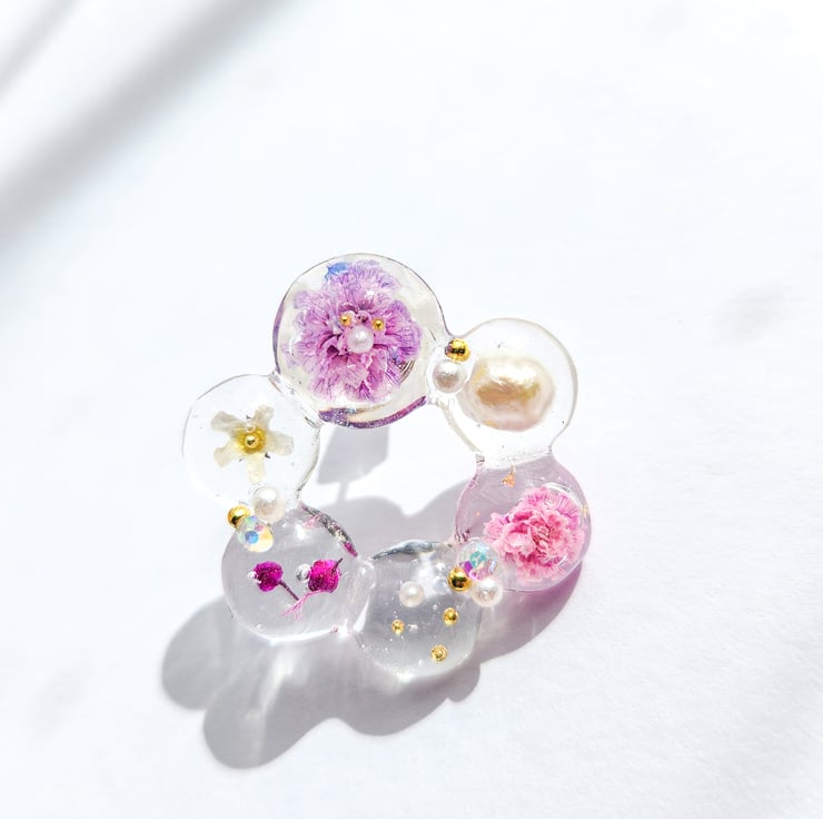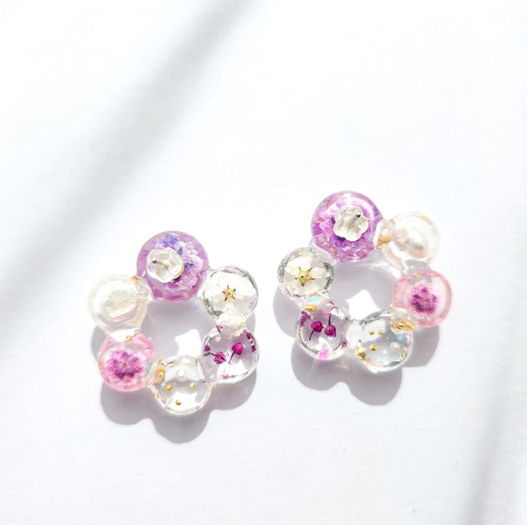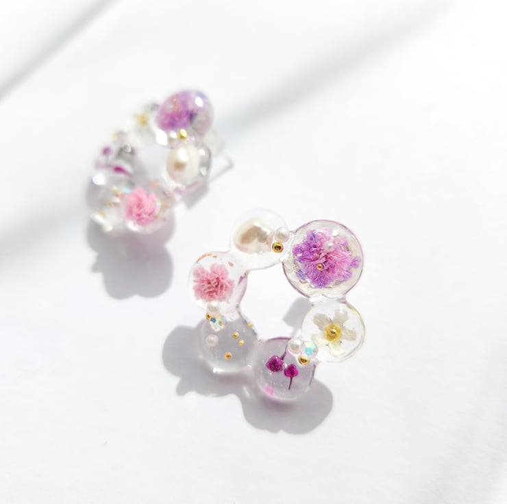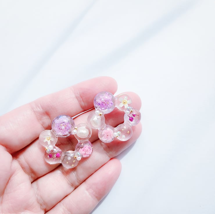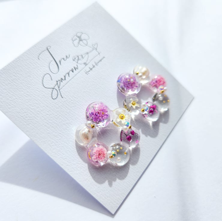 A pair of delicate handmade earrings, where real dried flowers are solftly preserved within clear resin, like tiny floral moments captured in time.