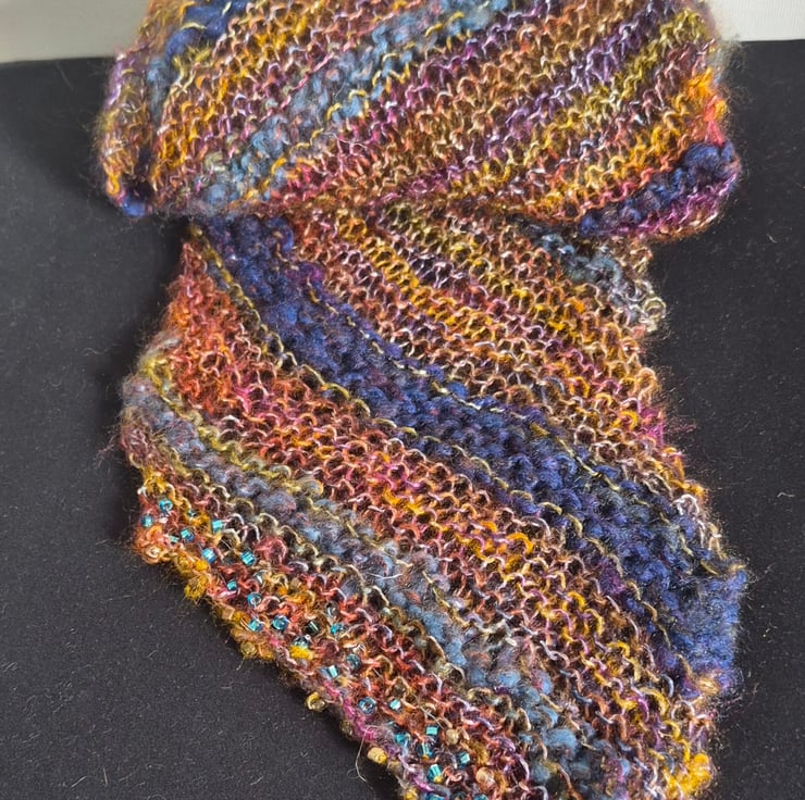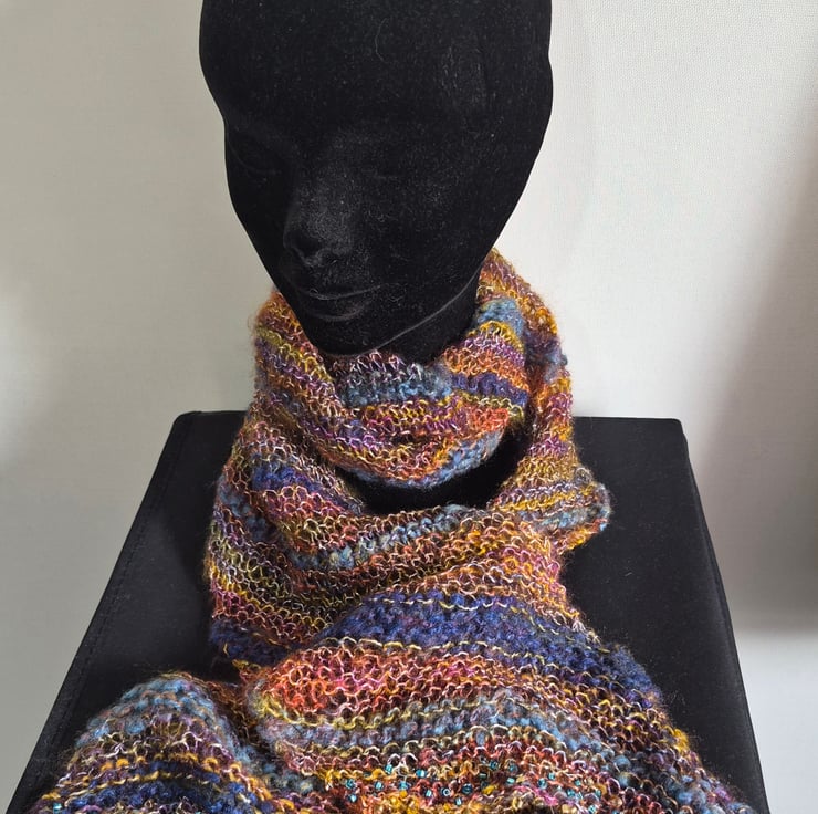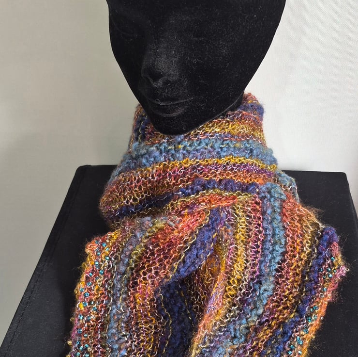 Hand knitted multicoloured long scarf with lots of sparkle. The scarf is knitted on a larger needle than normal making it open and light in appearance. it is a multi textured blend of synthetic yarn from my stash. The scarf is knitted on the diagonal and finished with blue and gold beads on the pointy ends.
