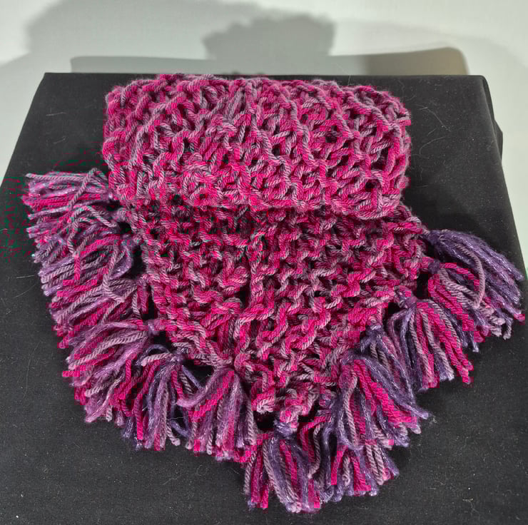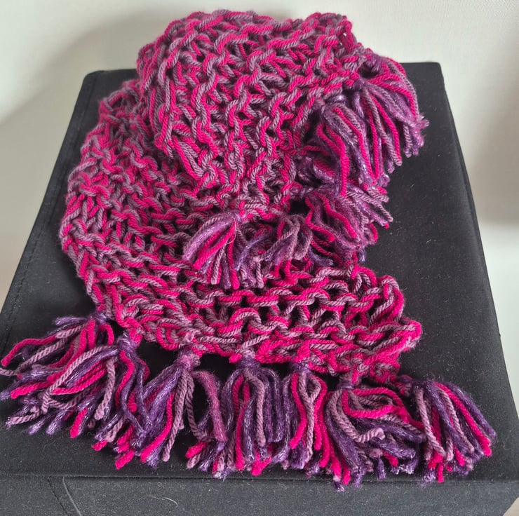 Hand knitted long thin scarf knitted on the diagonal. 100% acrylic yarn in cerise and mauve.