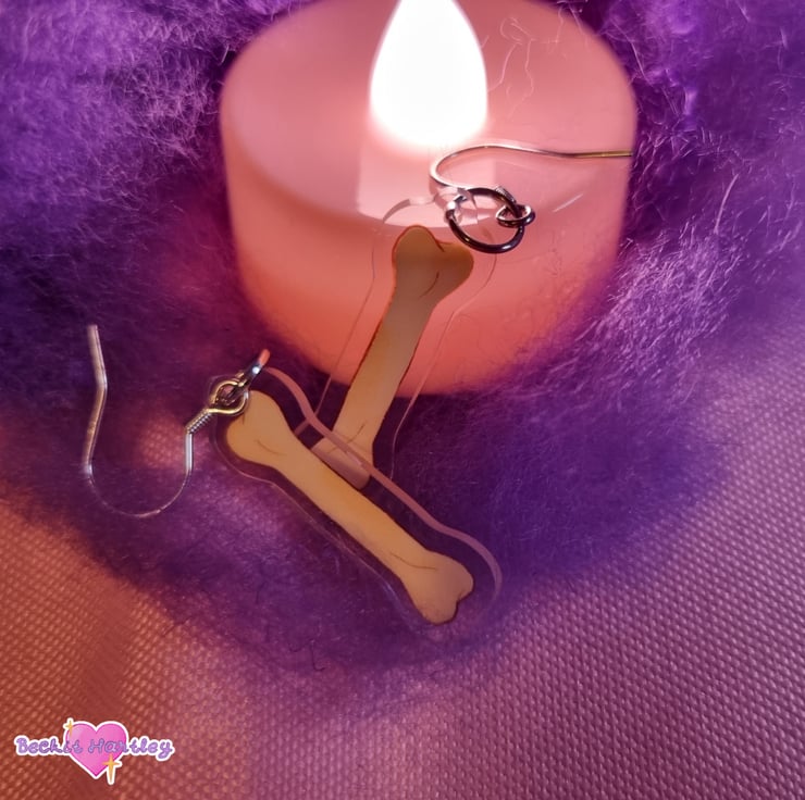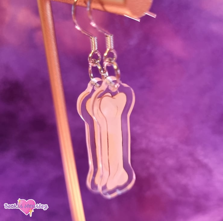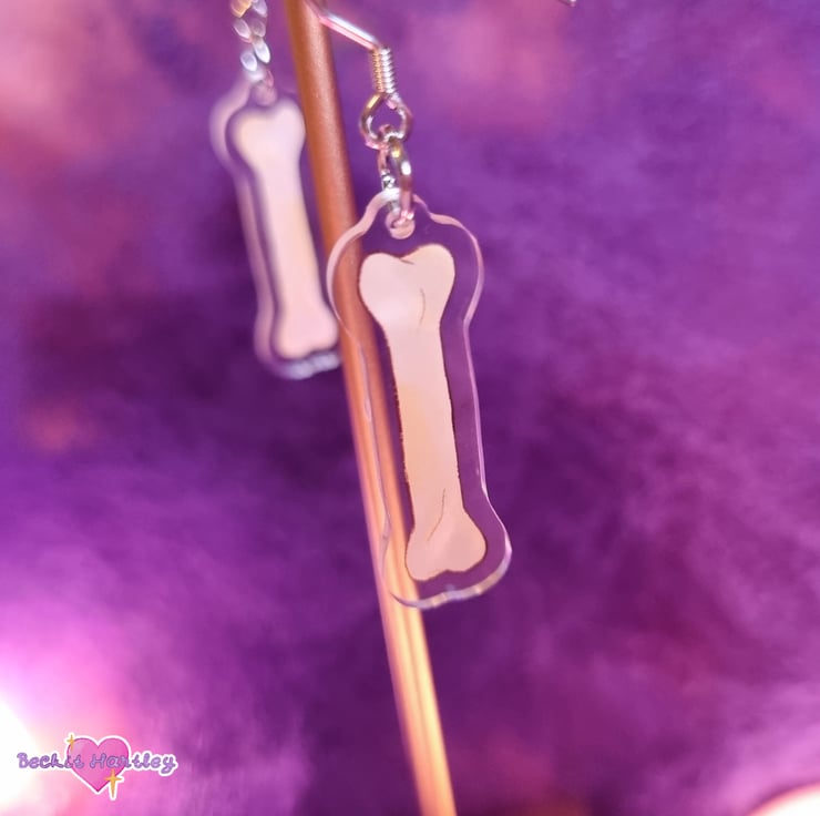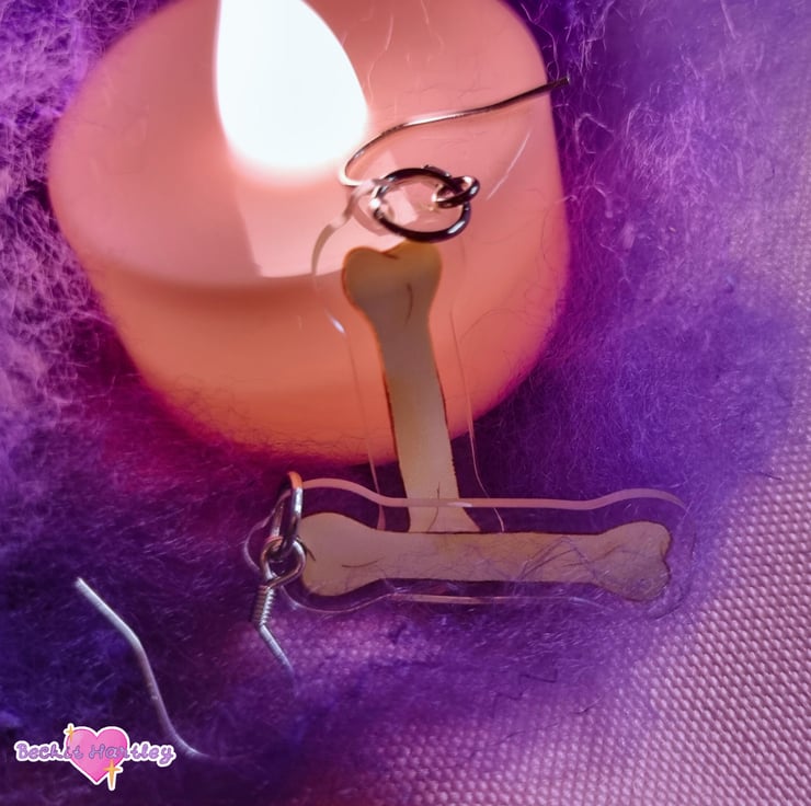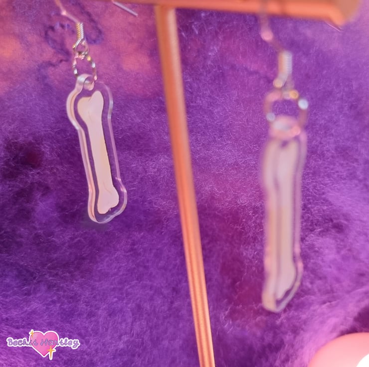 Featuring and original bone illustration with charms approximately 2.5cm in length, these acrylic earrings would make the perfect addition to your outfits!