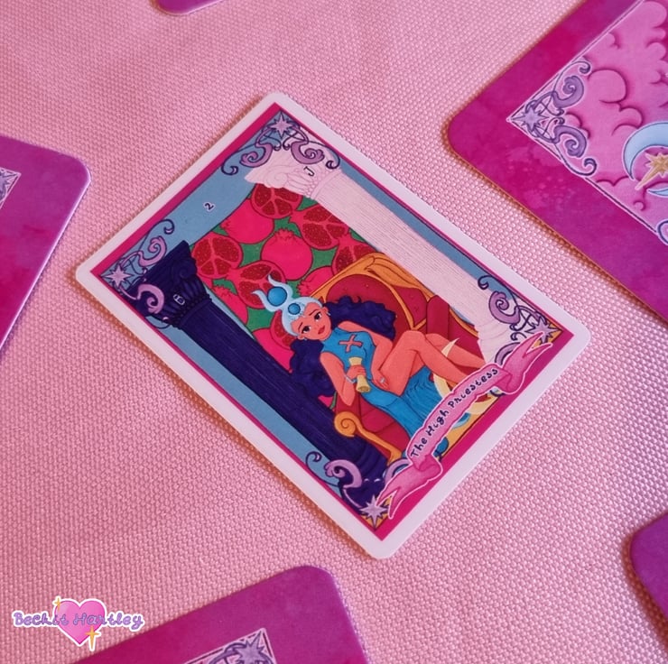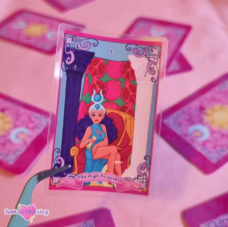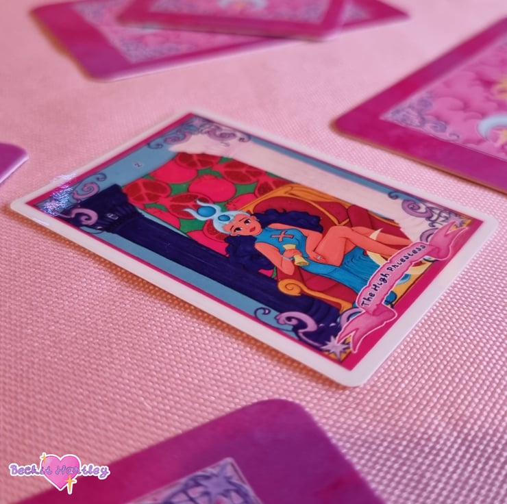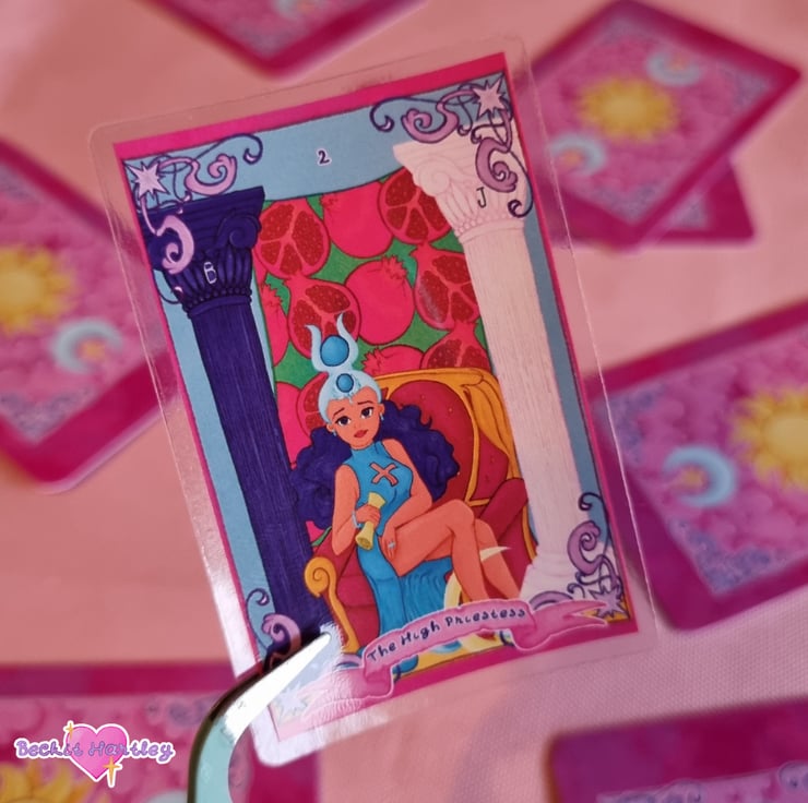 Featuring an original illustration of The High Priestess tarot card, inspired by the Rider-Waite deck and approximately 6cm x 5cm in size, this clear sticker is a great way to decorate your e-reader, cup, notebook or water bottle.