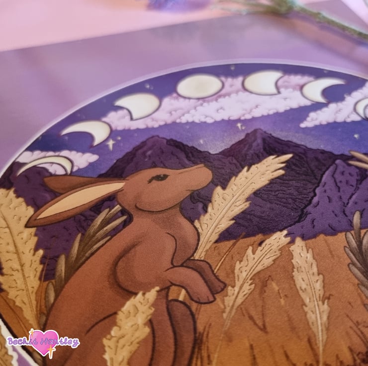 Mabel's familiar, Clover, adores gazing at the stars in the night sky, no matter the phase of the moon. Sometimes he will wander through golden fields to find just the right spot to watch in wonder.