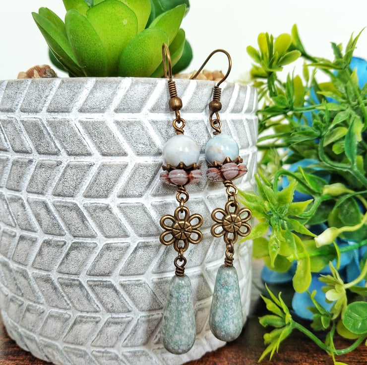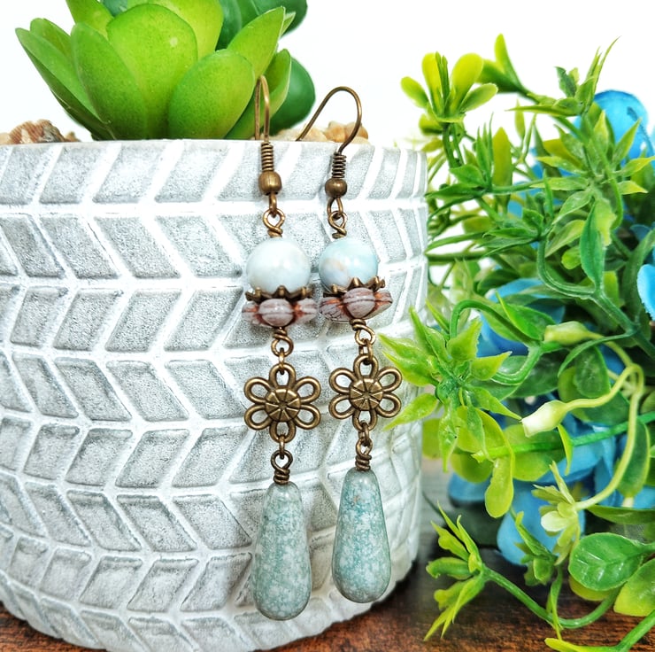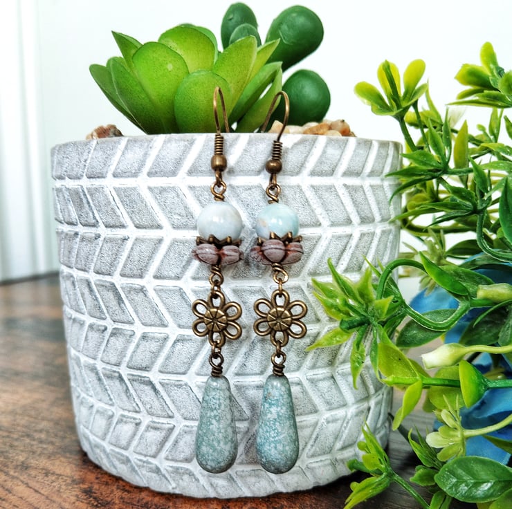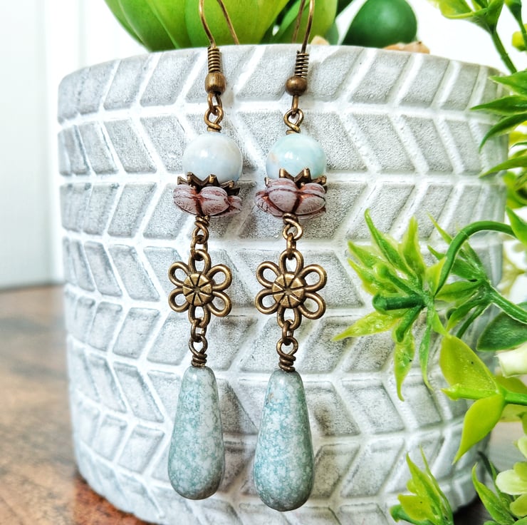 Add a little serene prettiness to your look with our bronze and light blue long teardrop earrings. A perfect blend of nature-inspired charm and vintage elegance, the tranquil hues of these blue drop earrings make them a stylish solution for both laid back summer days, and more formal events.