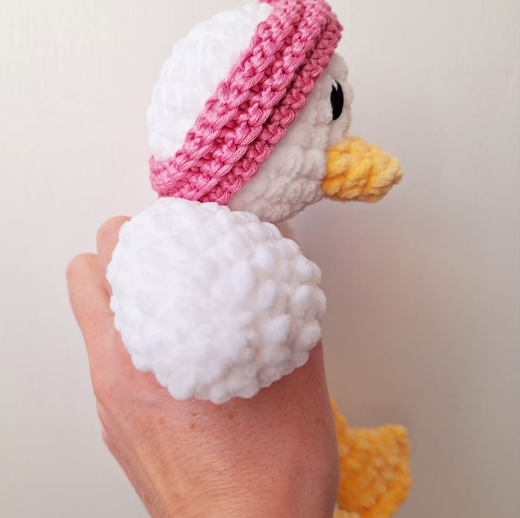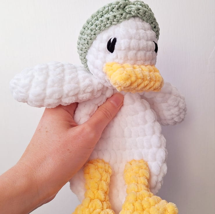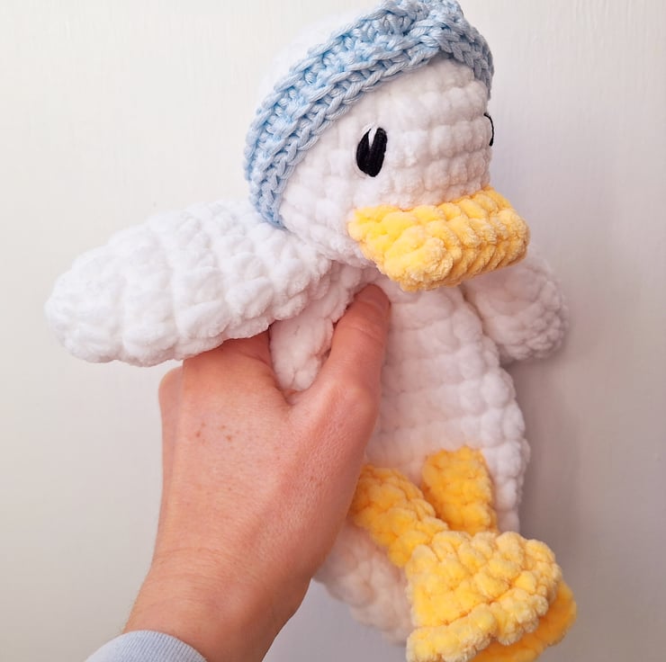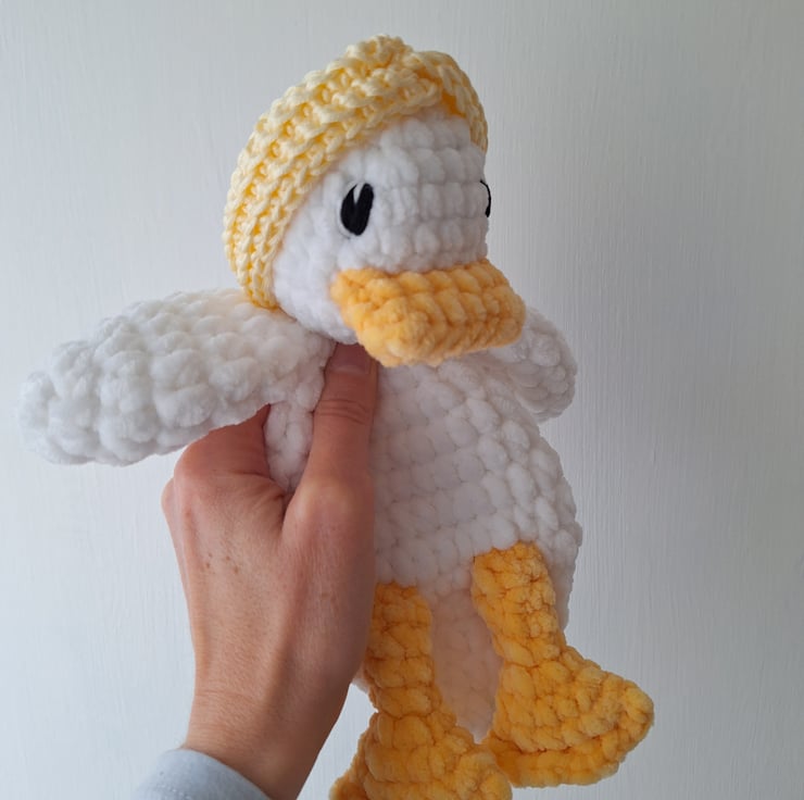 Handmade crocheted duck snuggler. The head is stuffed and the body is left flat like a blanket.