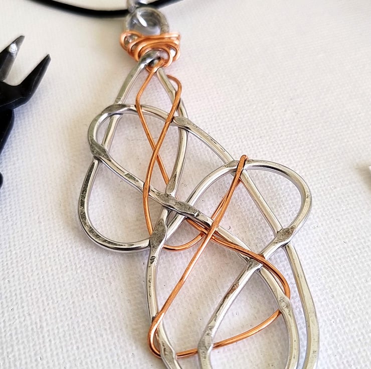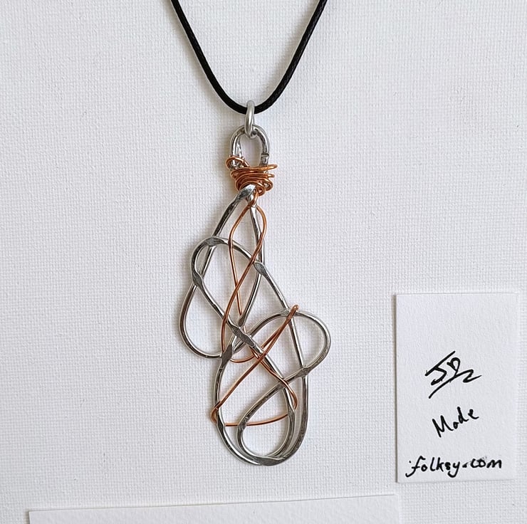 Unique mixed metal pendant. This piece features a fluid, abstract design carefully formed from hammered aluminium wire, intricately entwined with burnished copper accents. The interplay between the cool silver tones and the warm copper glow creates a striking, modern aesthetic that complements any outfit.