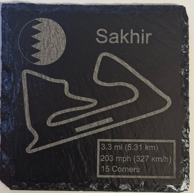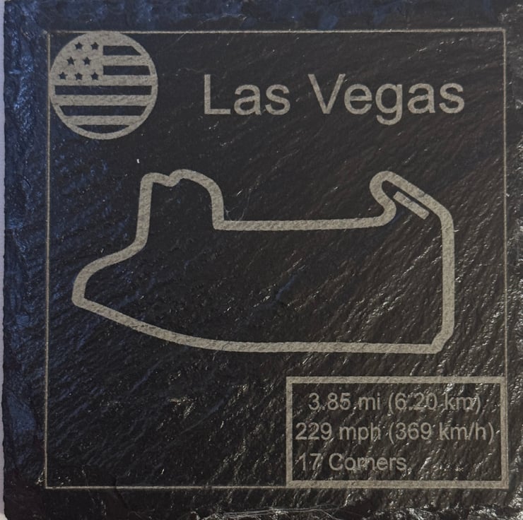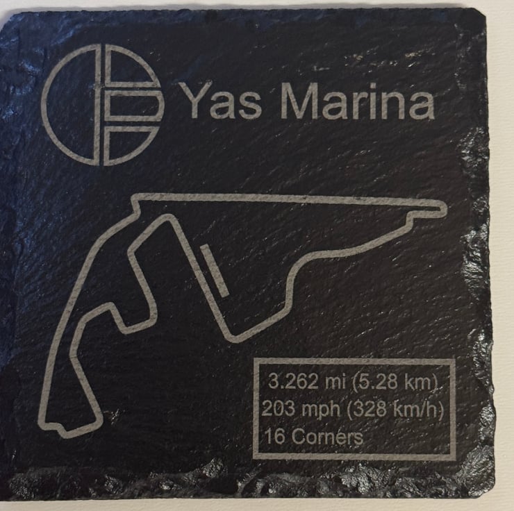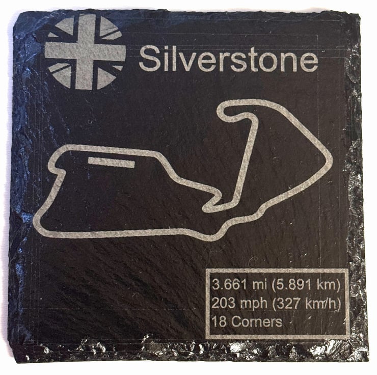 Celebrate the speed and precision of Formula One with this handcrafted 100mm x 100mm natural slate coaster, featuring the iconic layouts. Expertly engraved with the full track outline and key race data, this unique piece is perfect for motorsport fans, collectors, and Formula One enthusiasts.