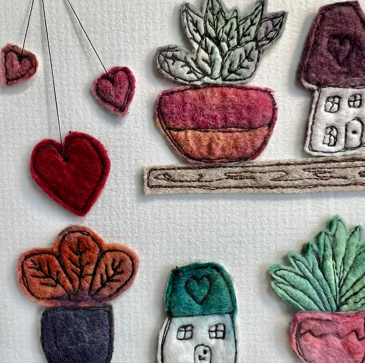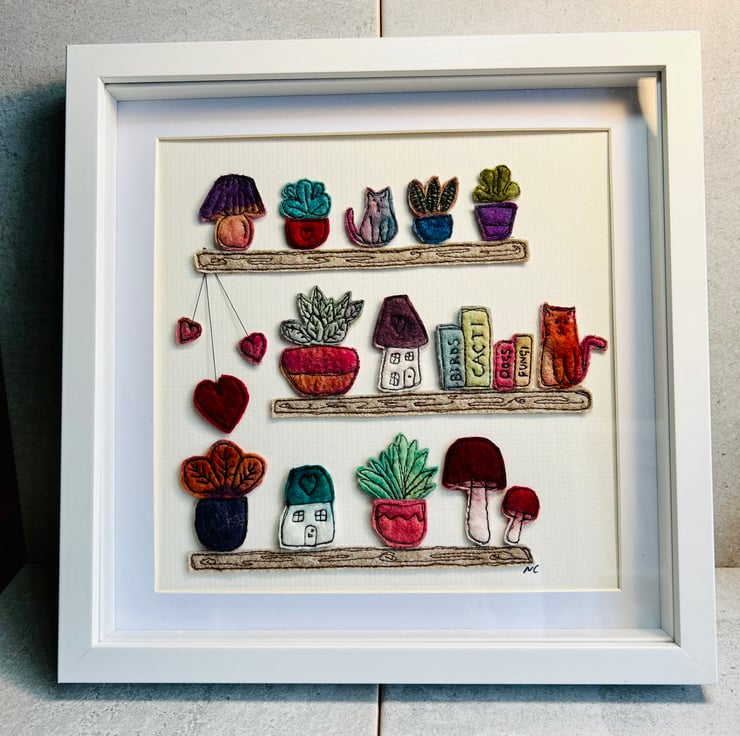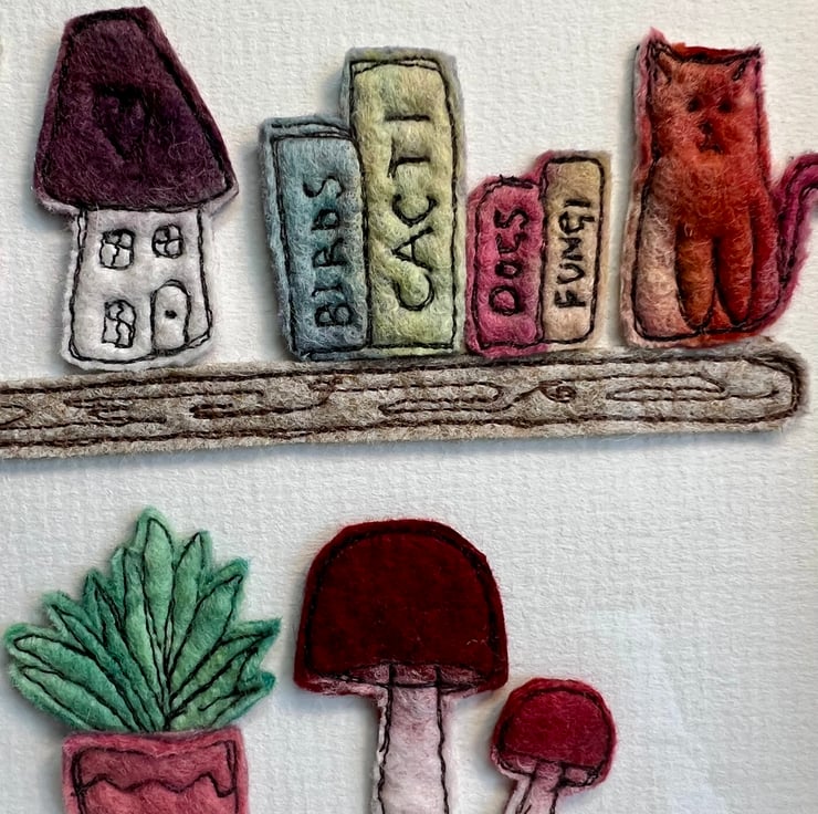 Large felt picture of plants, cats and books, made from my own felted wool and drawn on designs by free motion stitching, mounted in box frame with glass