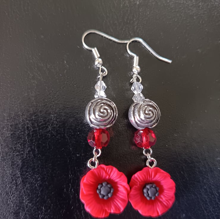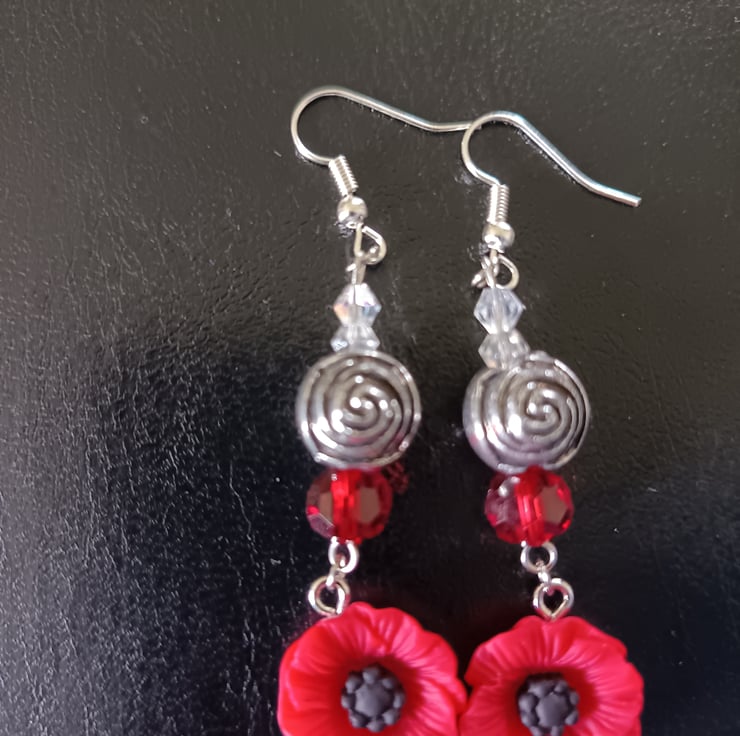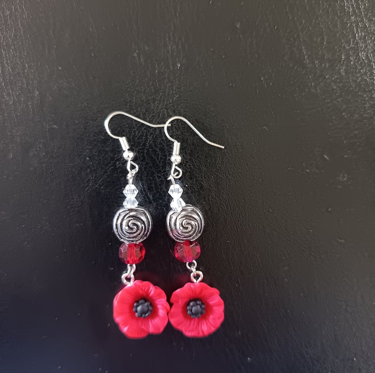 These handmade earrings are crafted with stainless steel hooks, bold red resin poppy charms, chunky silver statement beads and red and clear glass beads.