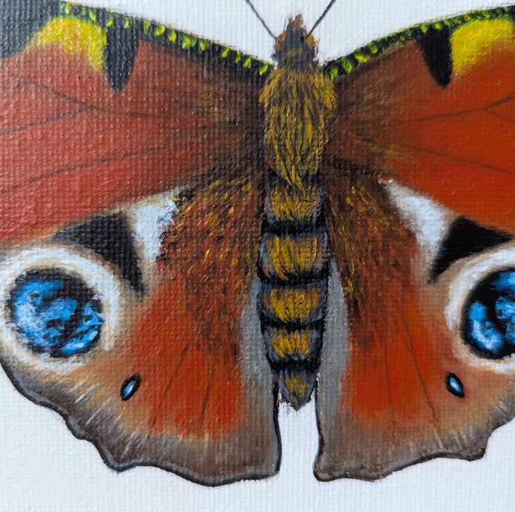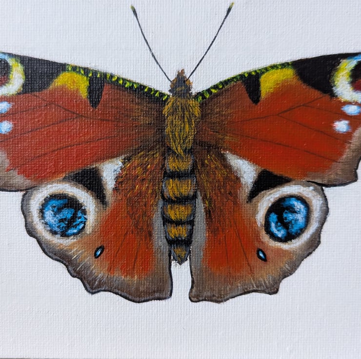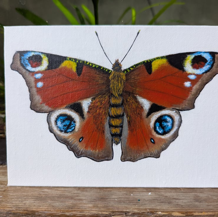 This is a hand painted, acrylic Peacock Butterfly on a 7" x 5" flat canvas board.