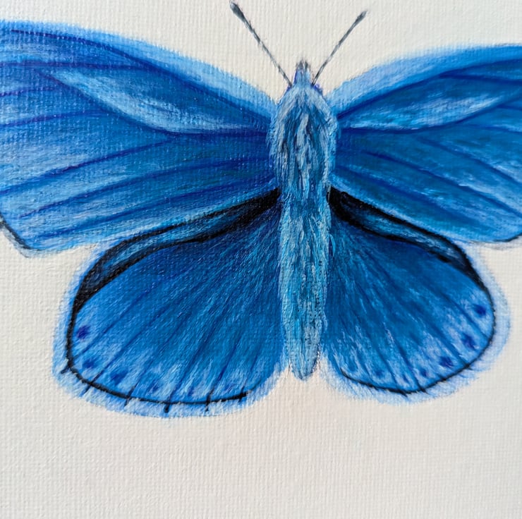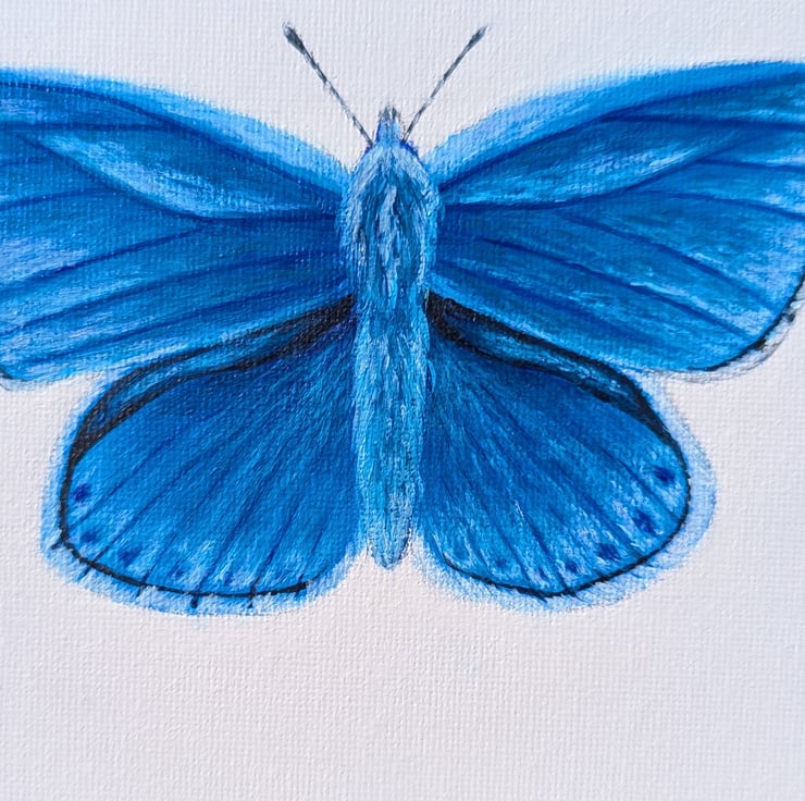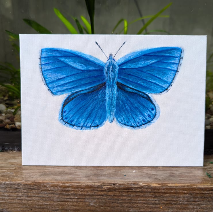 This is a hand painted Adonis Blue Butterfly on a 7" x 5" flat canvas board.