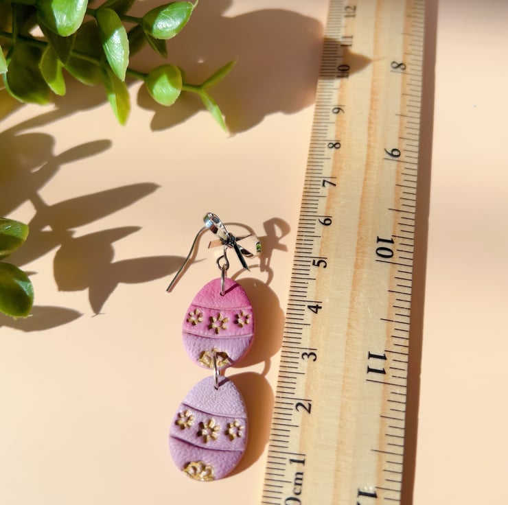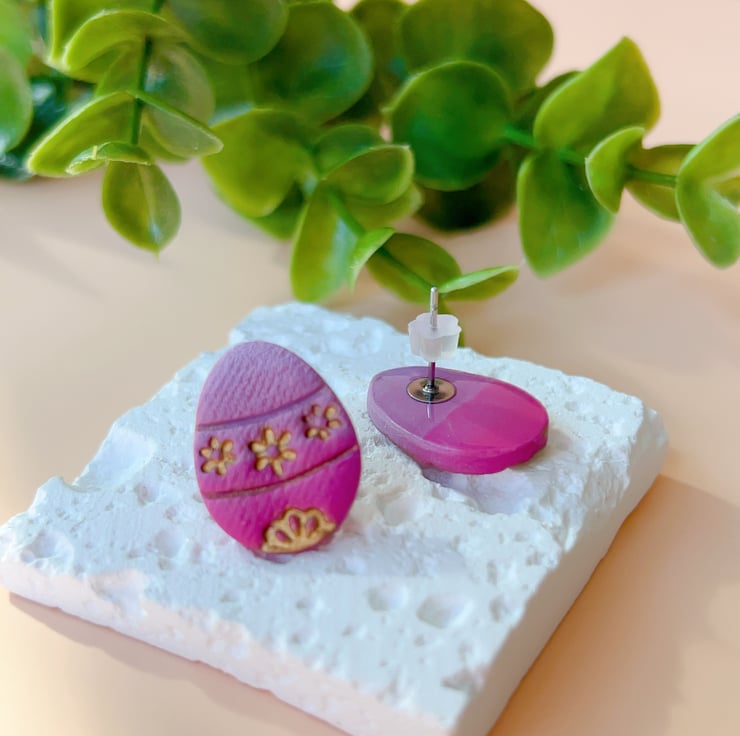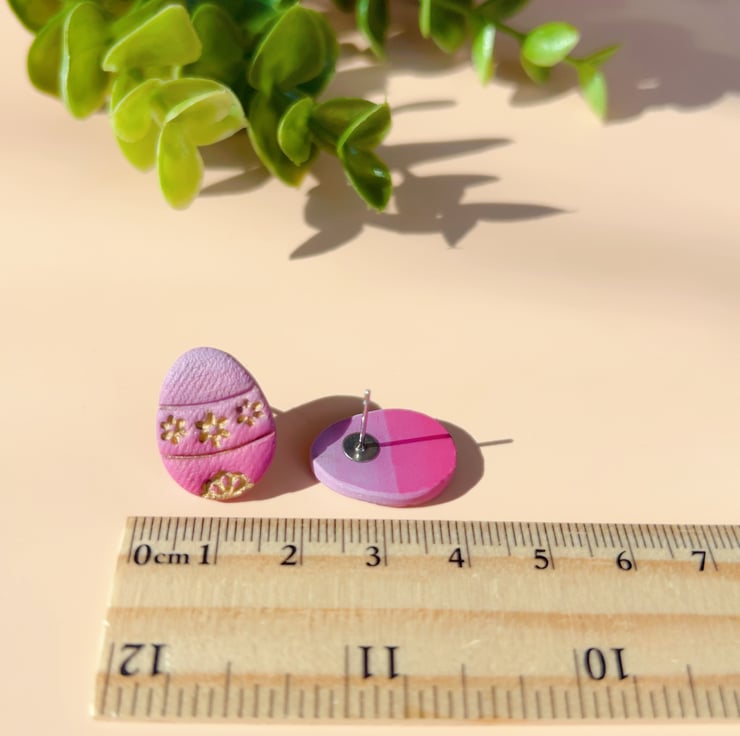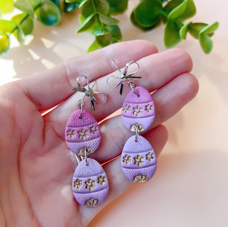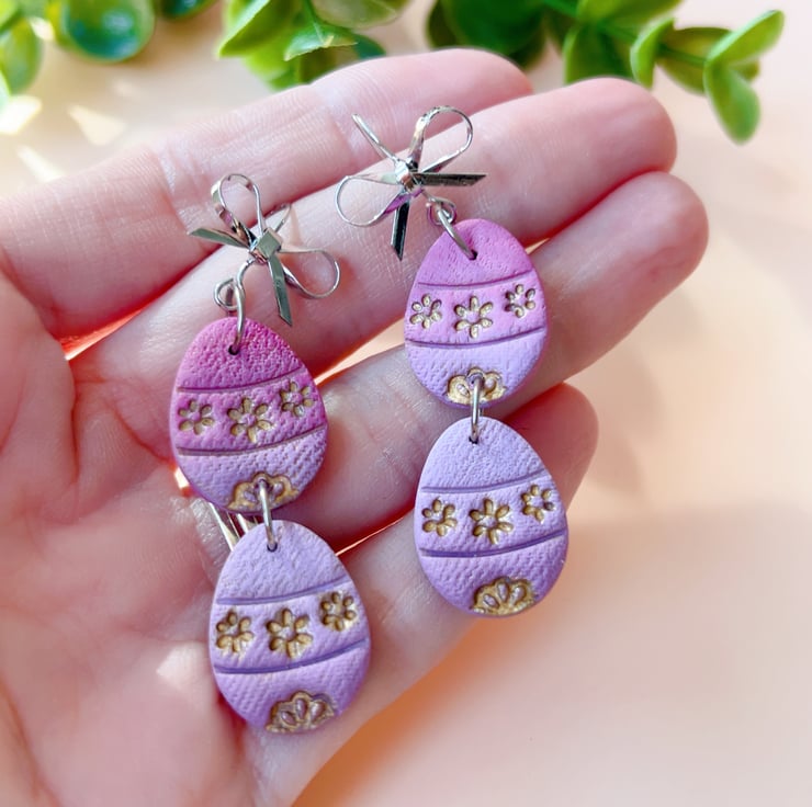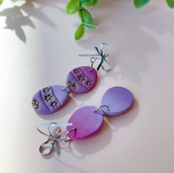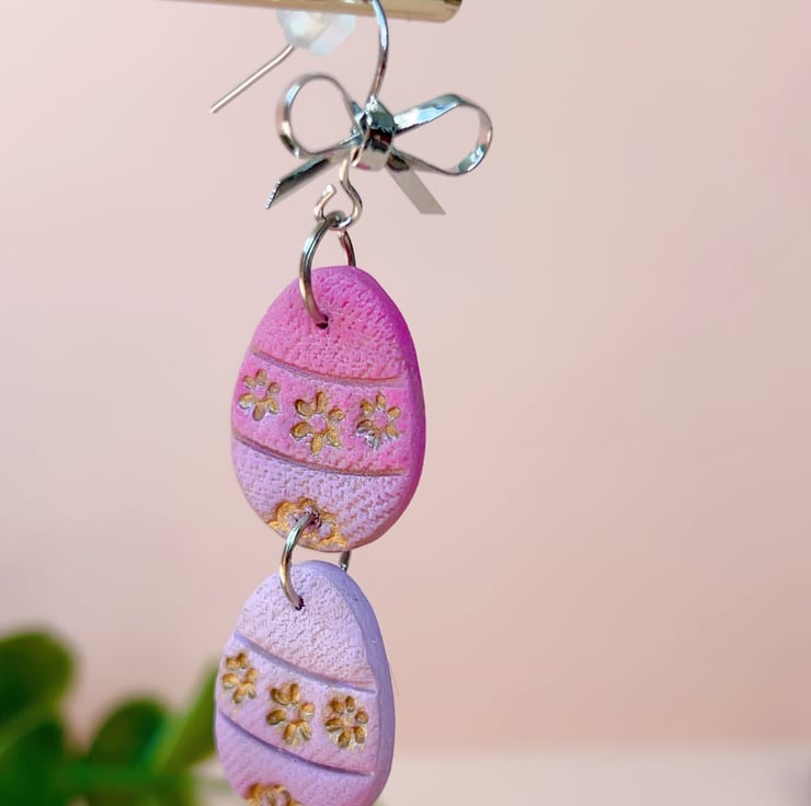 Handmade Easter egg earrings. Pink & purple floral clay design. Long drops with bows or cute studs. Hypoallergenic silver posts. FREE UK Delivery.