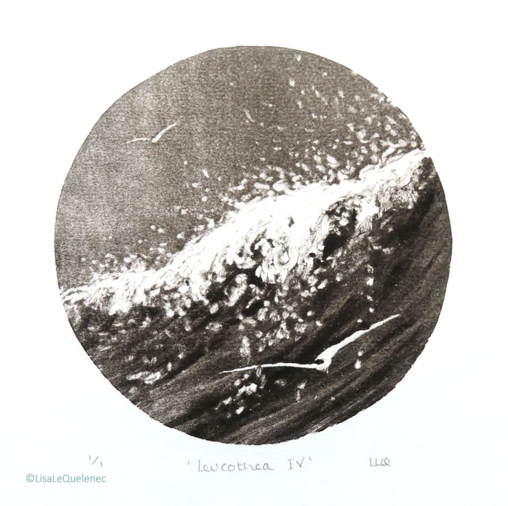 Gulls gliding on the brisk wind in and out of the surf - a black and white monoprint in a circular composition.