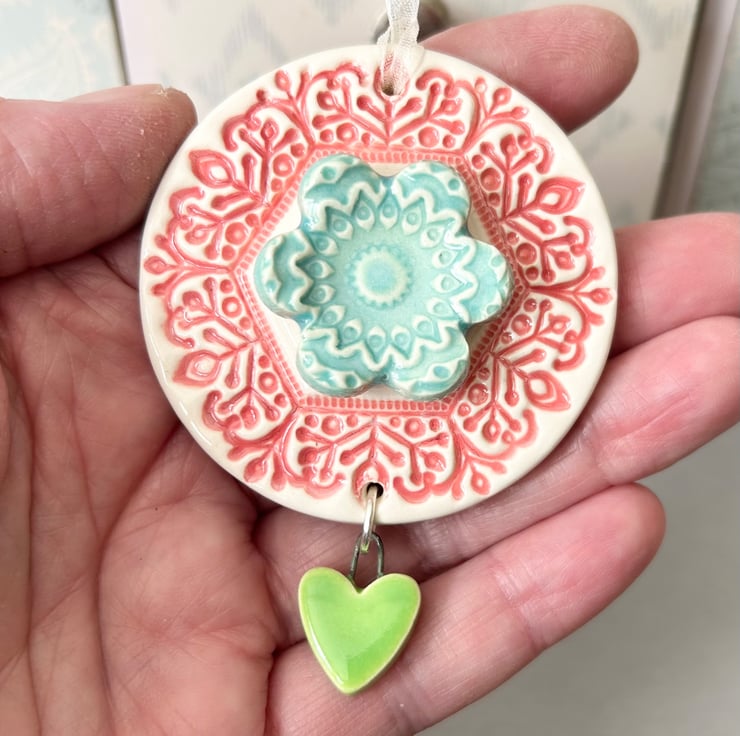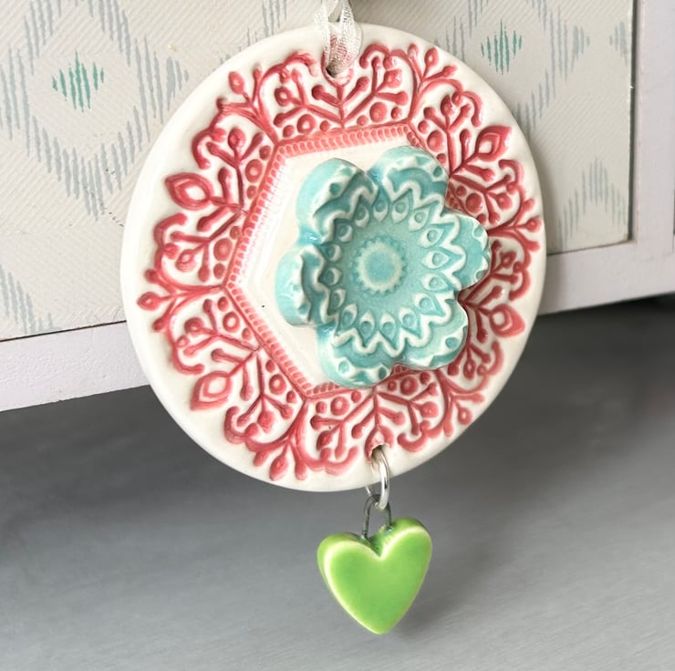 This little flower decoration is made from white earthenware clay and decorated with pattern. It has a dangly heart. It has been fired twice and finished with a glossy glaze for a lovely smooth finish. It measures 5.5 x 5.5cm and hangs from a cream organza ribbon.