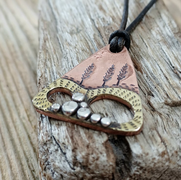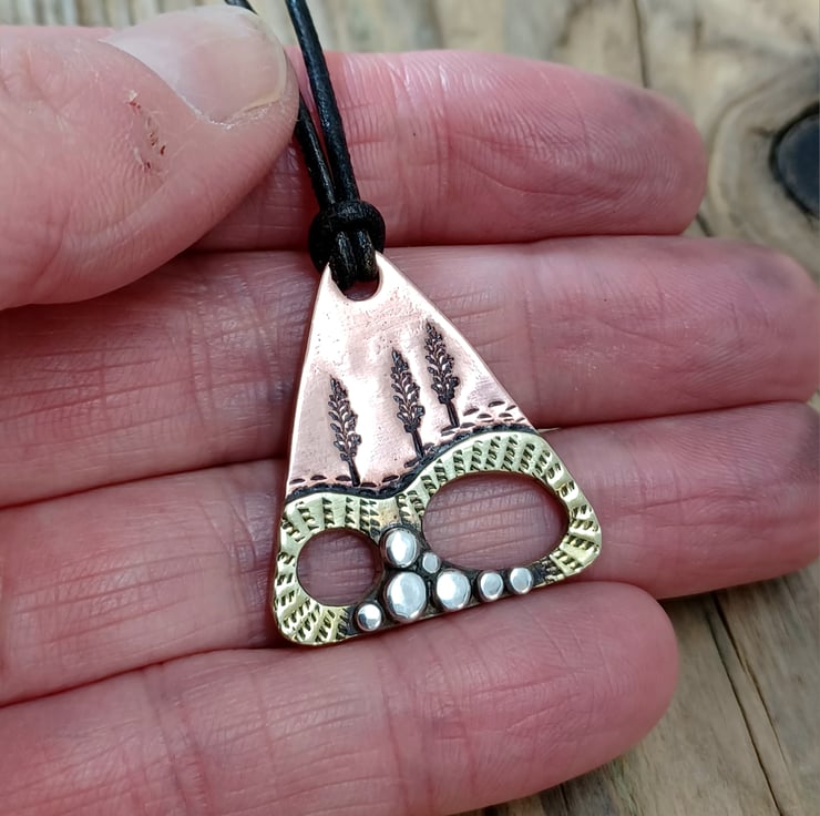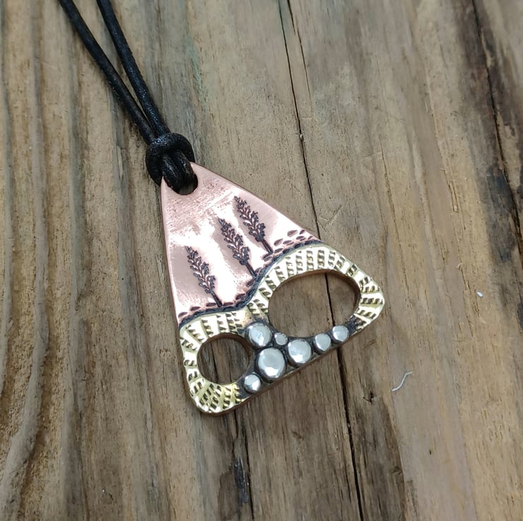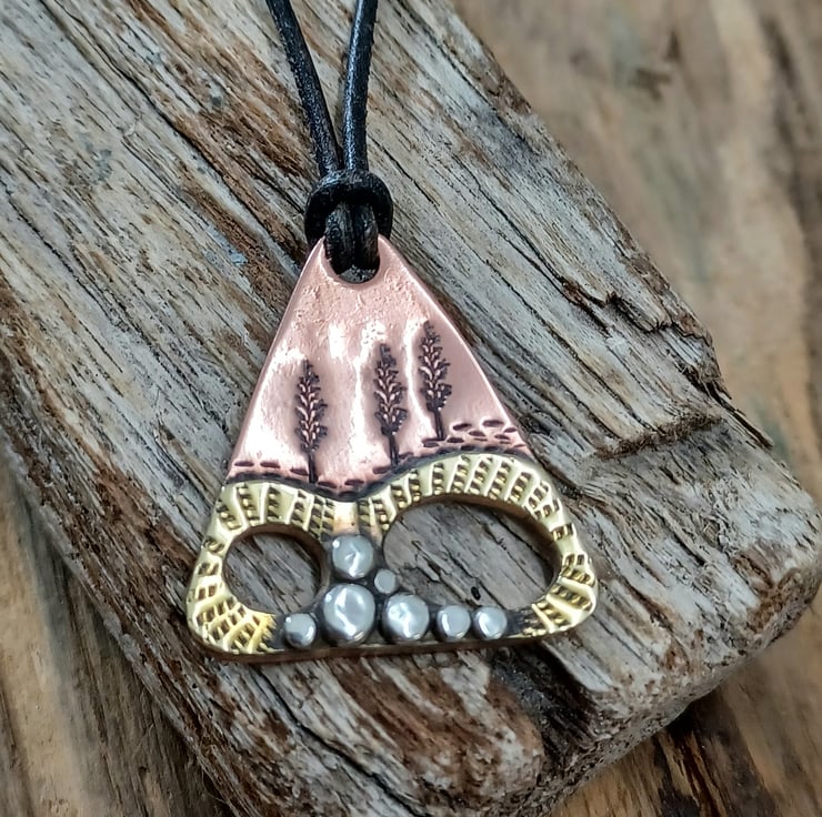 Made from thick copper sheet with soldered on layers of brass and silver. The scene has trees, a foreground of brass and a little silver rocky outcrop. Two organic circles have been pierced out of the pendant with a saw to add an abstract feel. All filed , sanded and polished to a smooth finish.