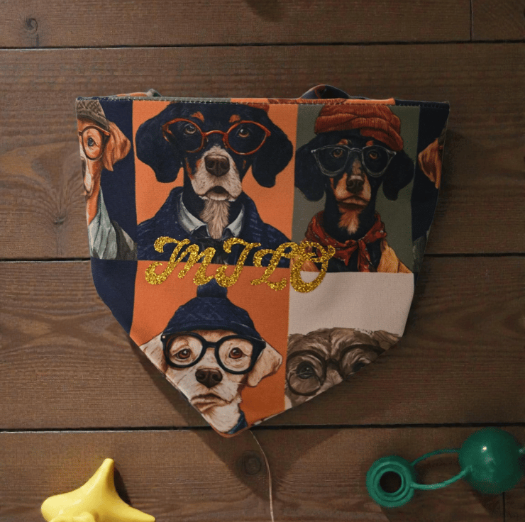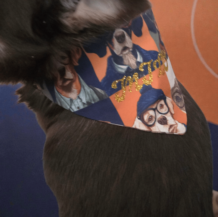 Great bandana made from good quality material comes in 3 sizes and can be personalised bandana as scruchie style back so no need for collar and be slipped over head making it very comfortable se sizes below