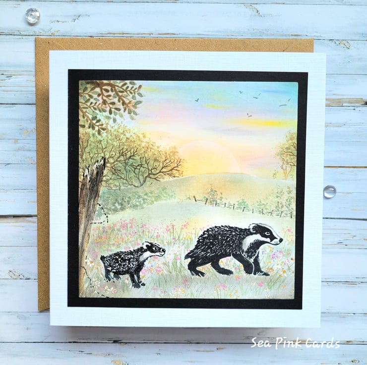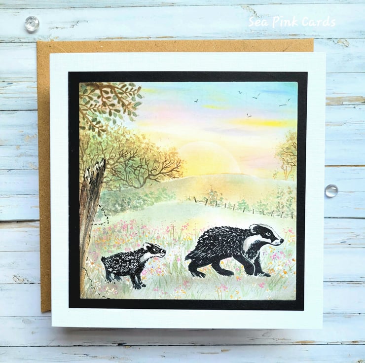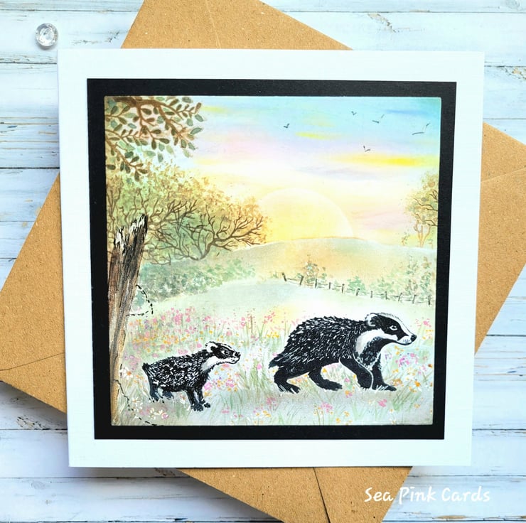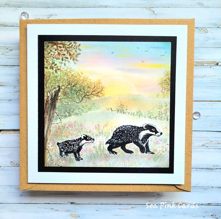 A unique, detailed blank card, with a countryside scene and badgers. Handcrafted and great for many occasions, including birthdays and father's day etc. A special card to keep and treasure. Measuring 14.5 x 14.5 cms, the cardbase is hand-cut from white recycled linen cardstock and is blank for your own greeting. It comes with a 100% recycled brown kraft paper envelope.