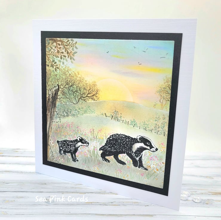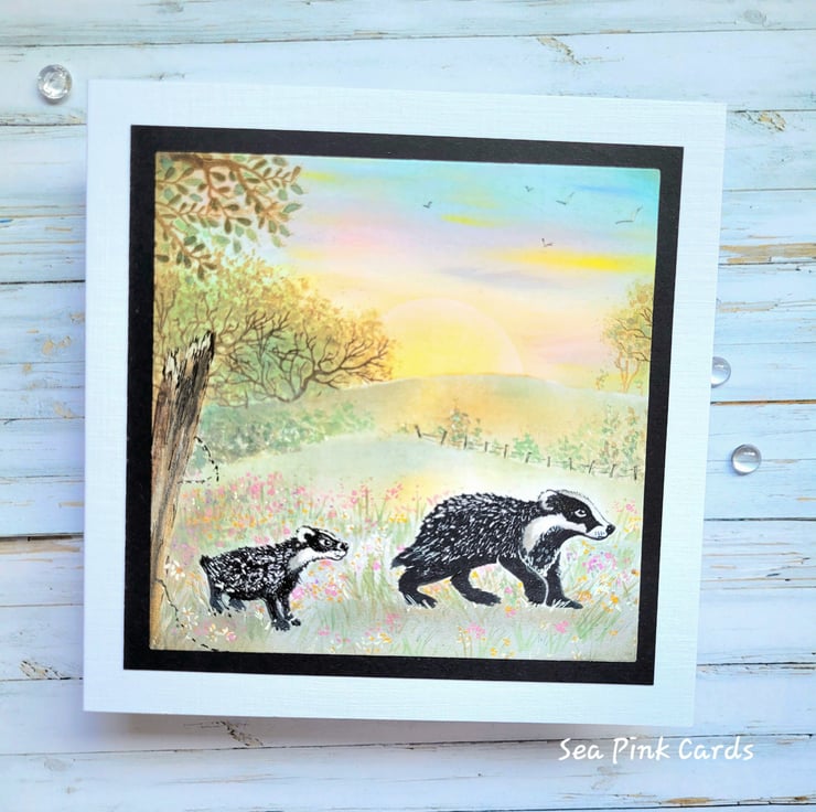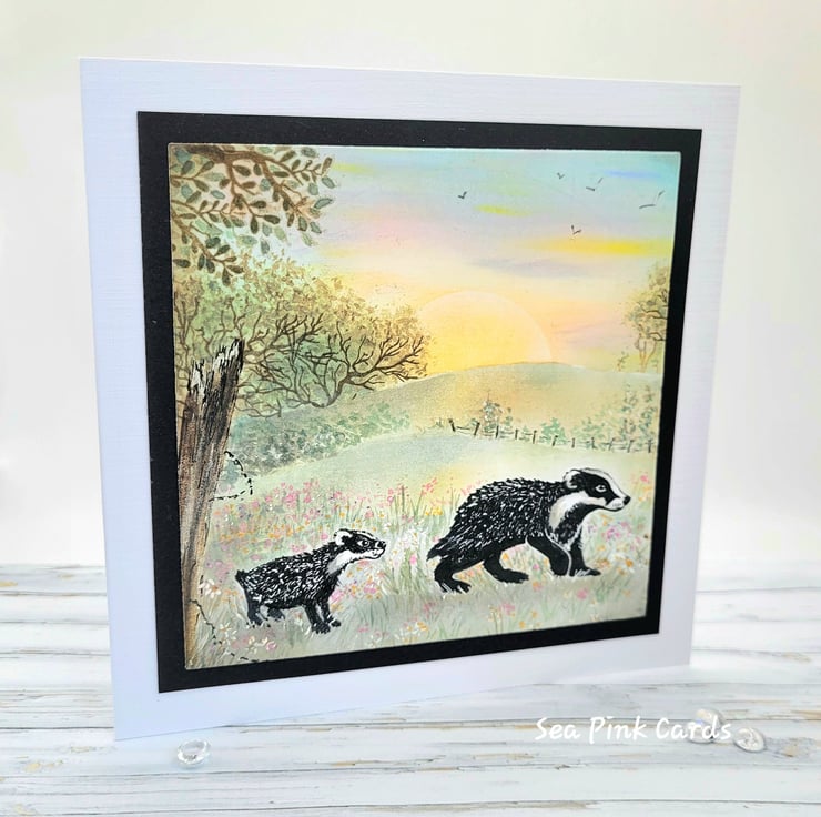 Layered design, with the background created using archival inks and brushes. The badgers are stamped with Card-io stamps and details added with fineliner pens. Additional shrubs, flowers and foliage are handpainted with watercolours. Water-based shimmer pen highlights enhance the design.