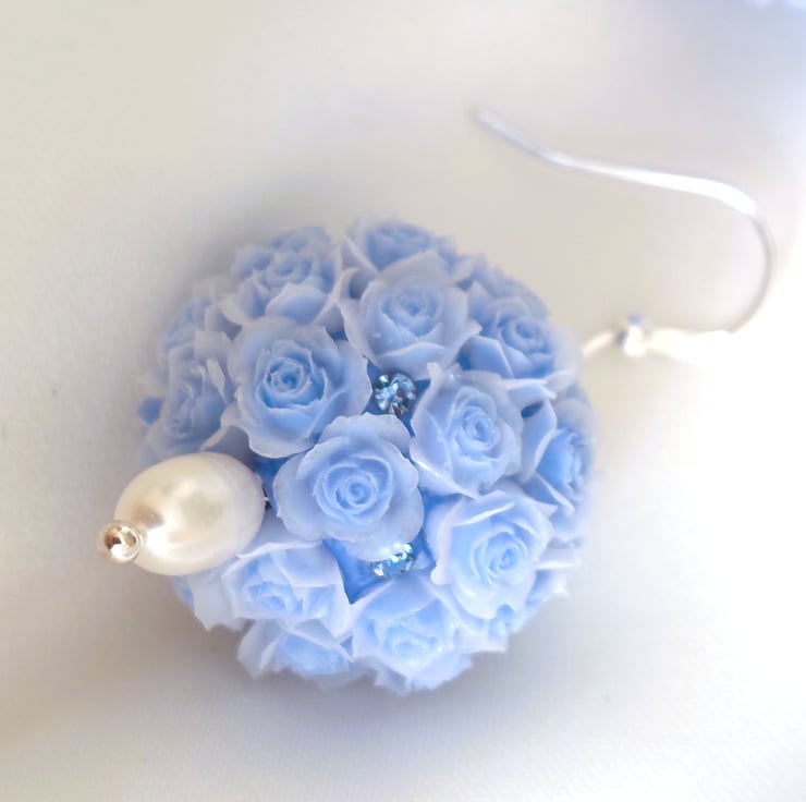 Pale Blue 3D Ball Of Roses Bouquet And Freshwater Pearl Sterling Silver Earrings