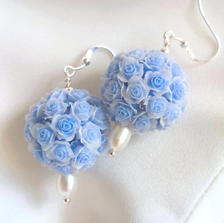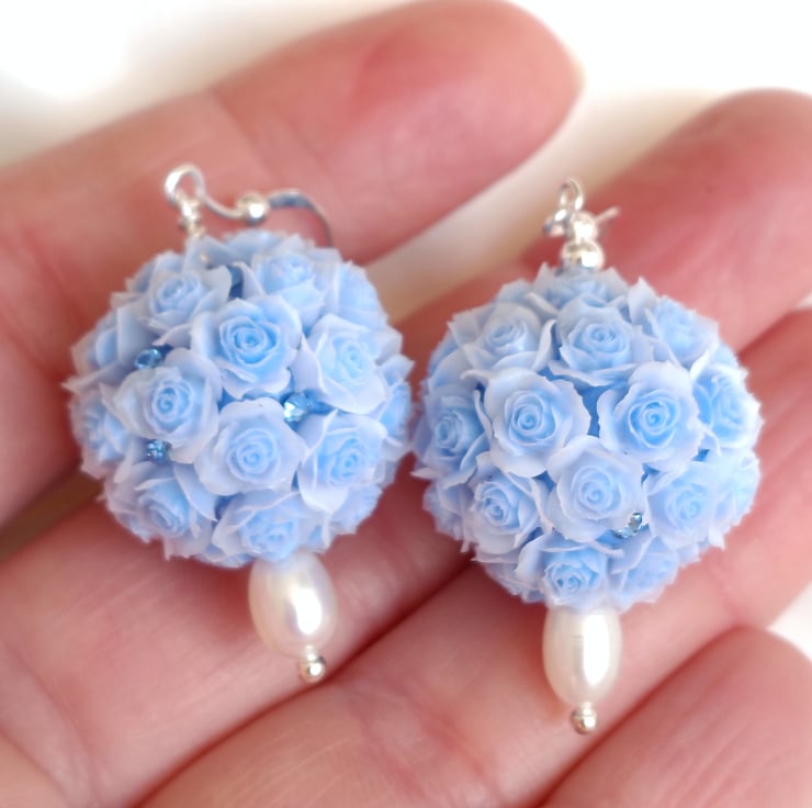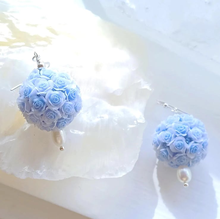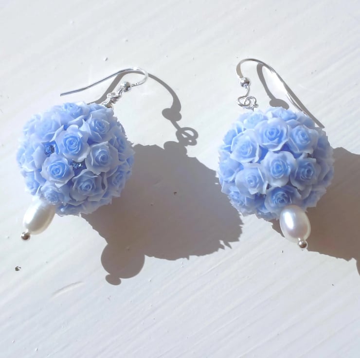 These gentle, feminine earrings are inspired by the sweetness of spring blooms and the soft glow of natural pearls. Each pair features a beautifully detailed pale blue 3D rose bouquet bead, paired with a smooth freshwater pearl that adds a touch of timeless elegance. Scattered amongst the roses are tiny blue crystals which glisten as the earrings move and catch the light.